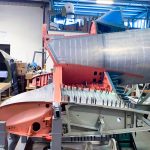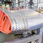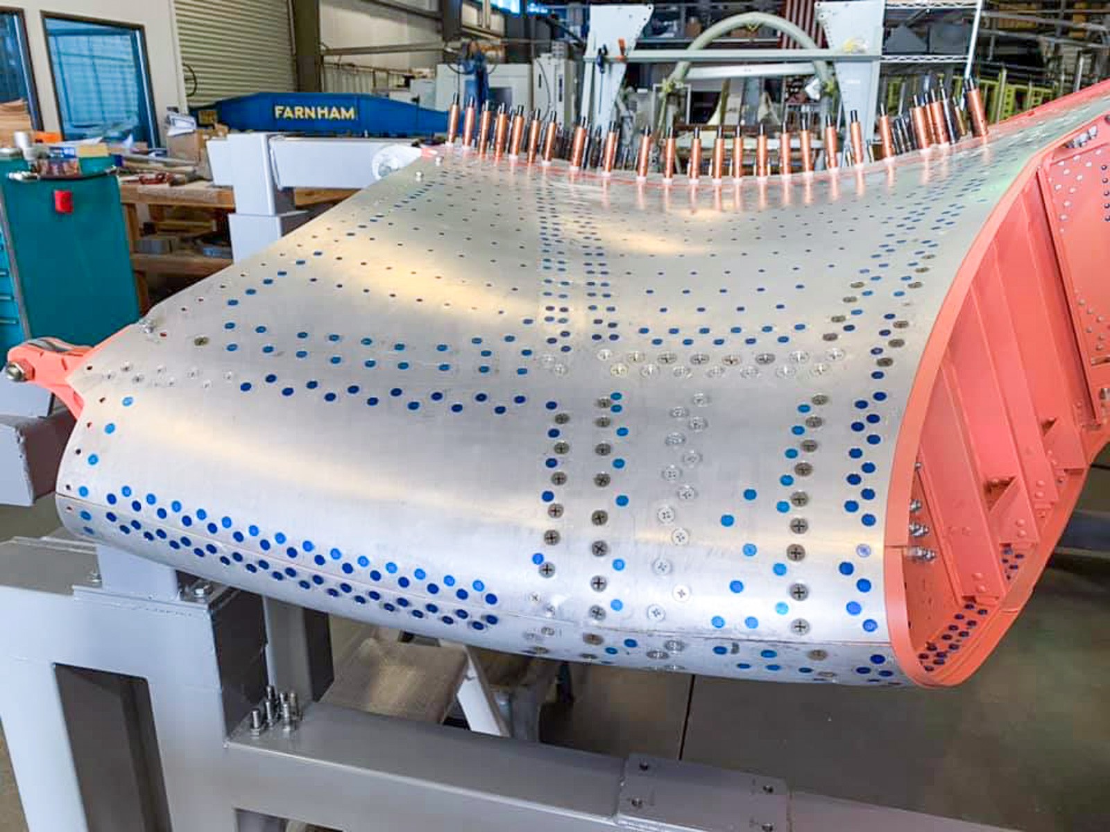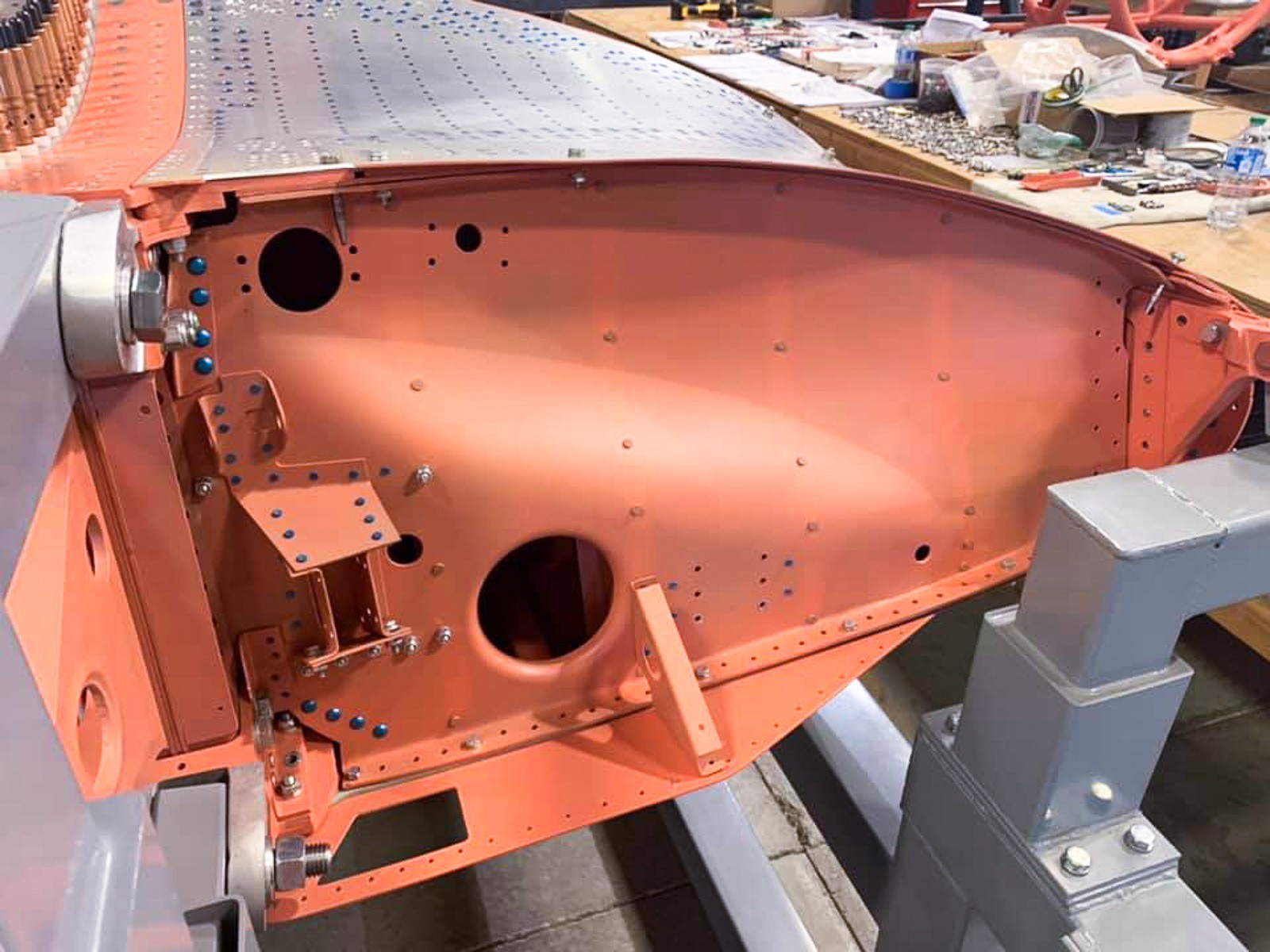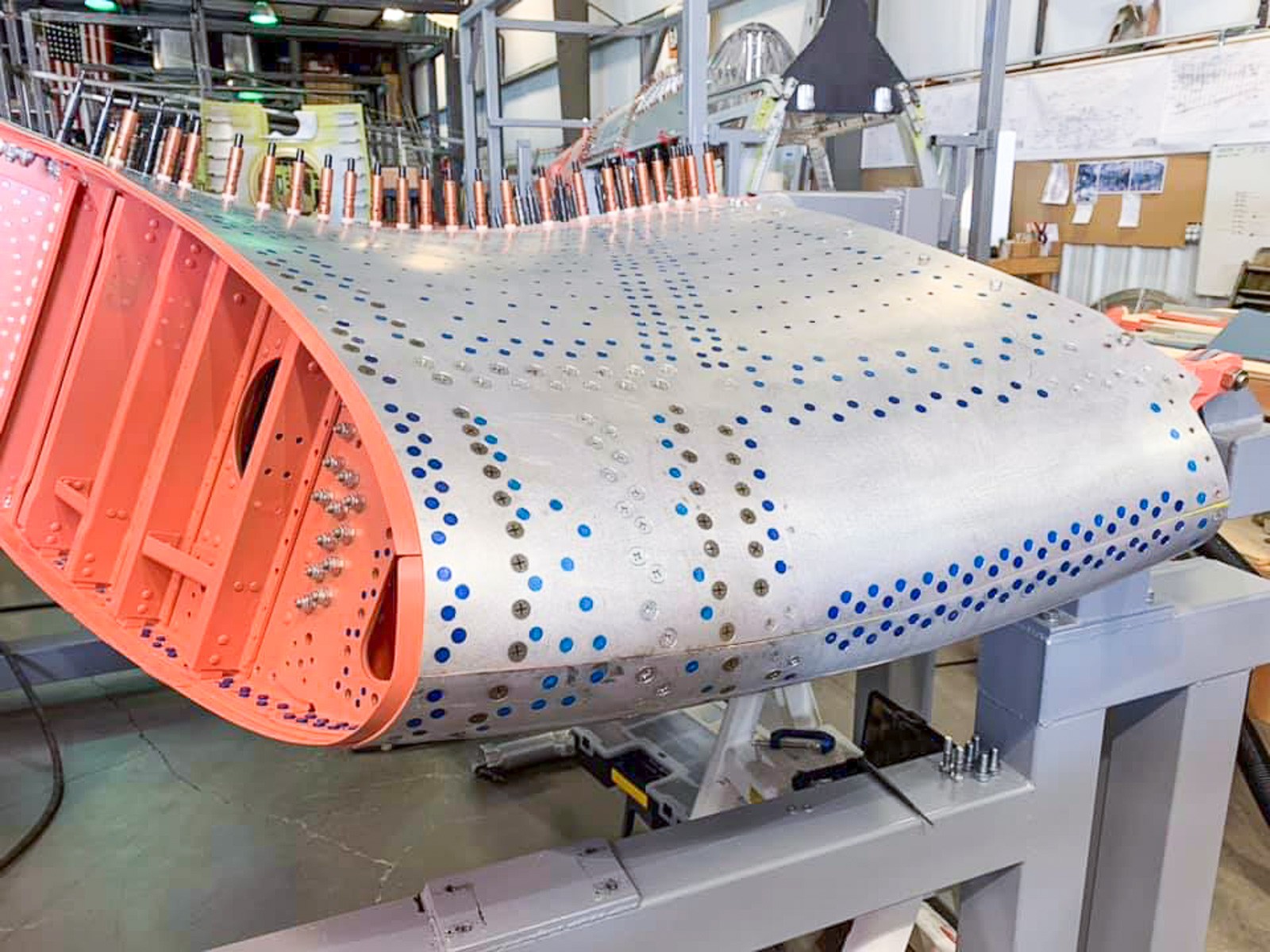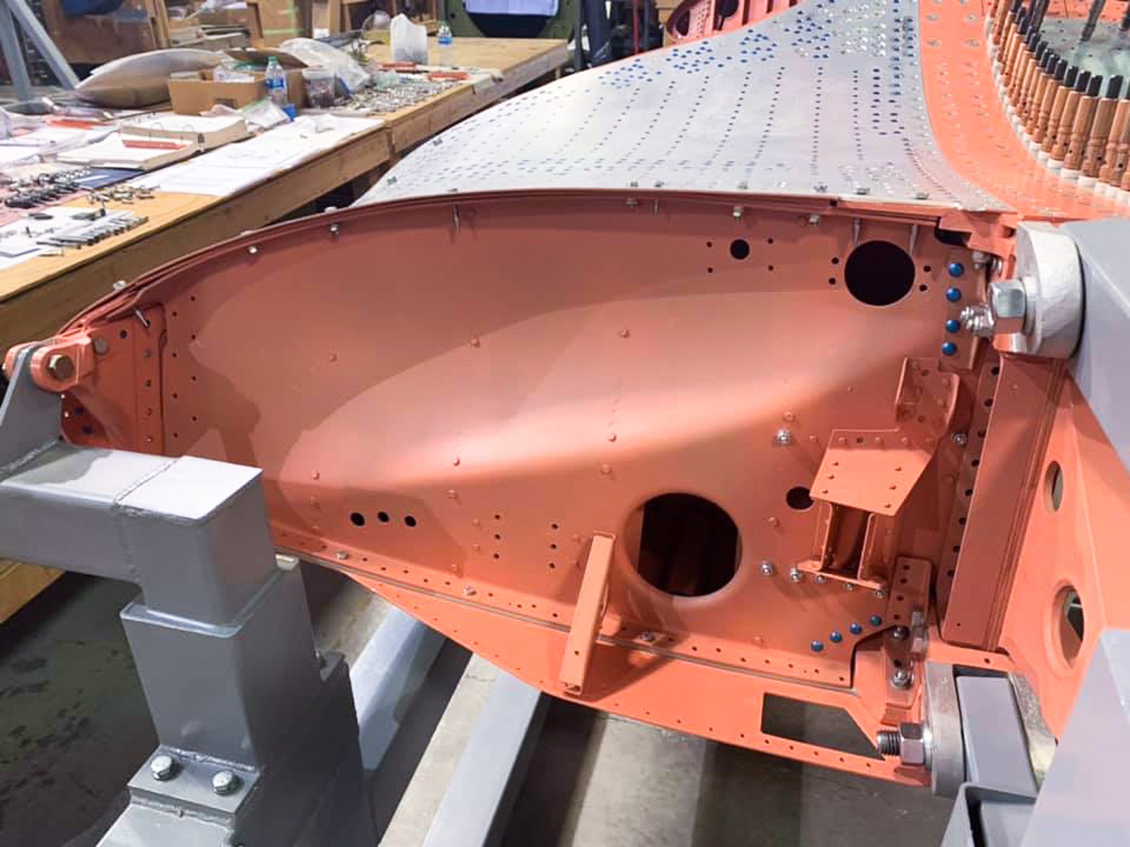 The center section leading edge assemblies are now coming together. Here we can see the salmon-colored end rib (VS-10704) undergoing installation. (photo via Vultures Row Aviation)