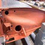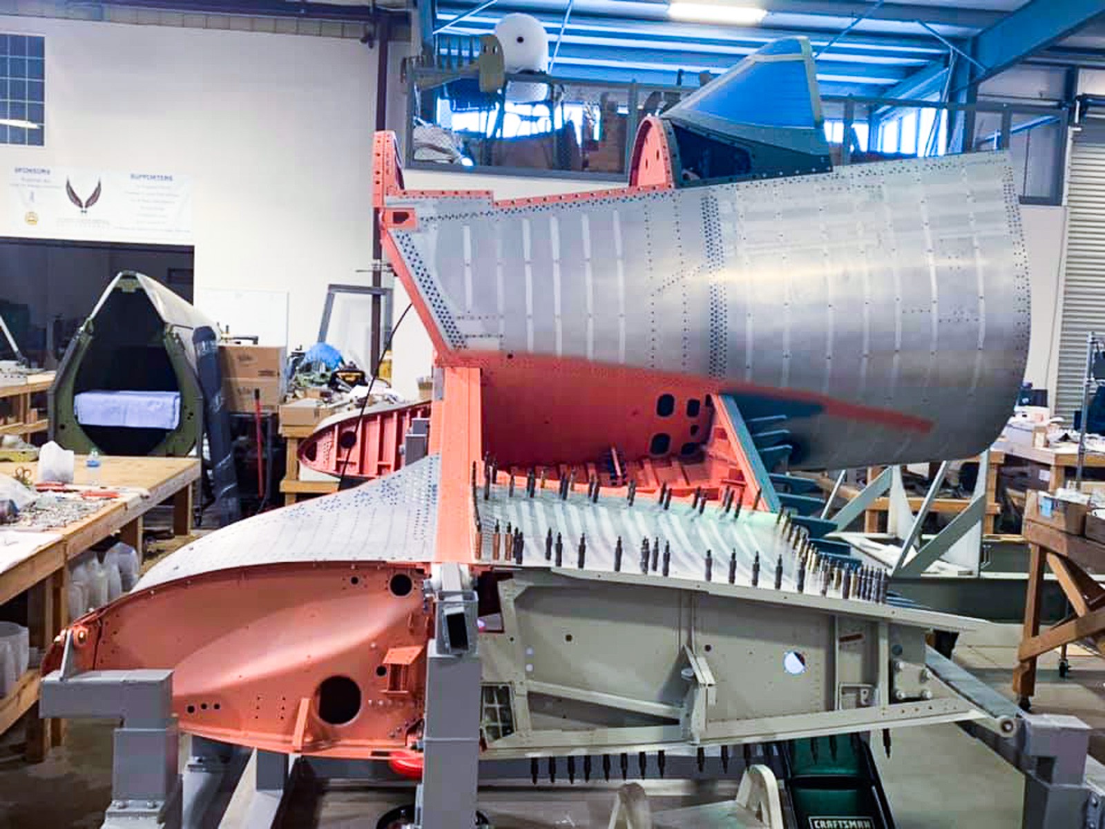 Skins assemblies on the ‘Birdcage’ Corsair’s center section are now undergoing final-fitting and riveting, as can be seen here on the starboard wing stub with assembly VS-15589 clecoed in place. (photo via Vultures Row Aviation)