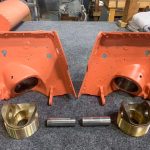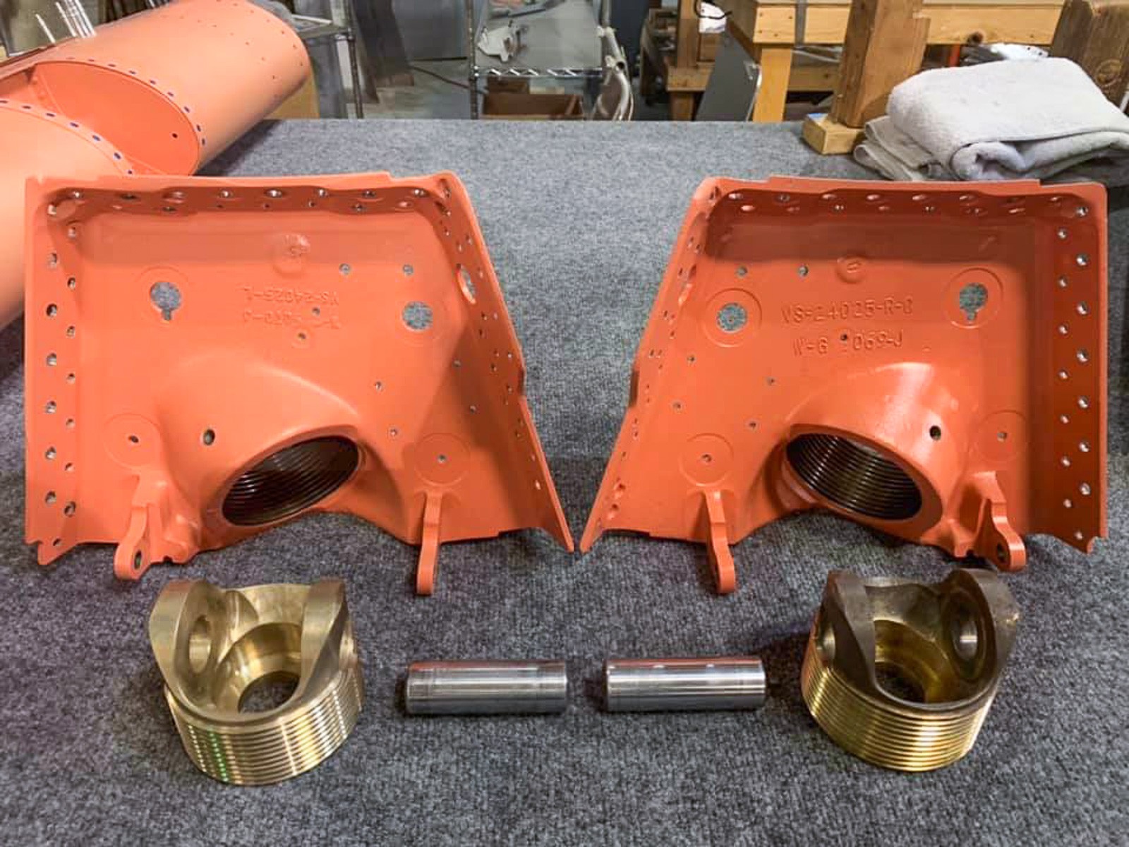 The salmon colored parts in the foreground are the landing gear knuckle forgings which mount in the forward end of each center section wing leading edge. The bronze components in front of these thread into the knuckles and allow the main landing gear legs to rotate back and forth between their stowed and extended positions. Of the latter components, the item on the left is of new manufacture, while the one on the right is a reconditioned original. (photo via Vultures Row Aviation)