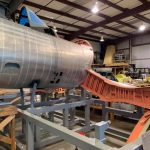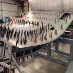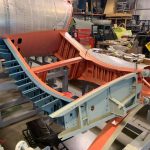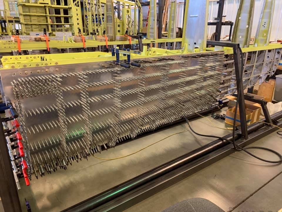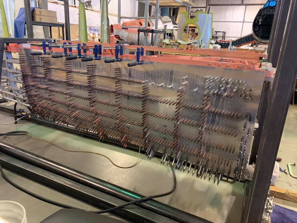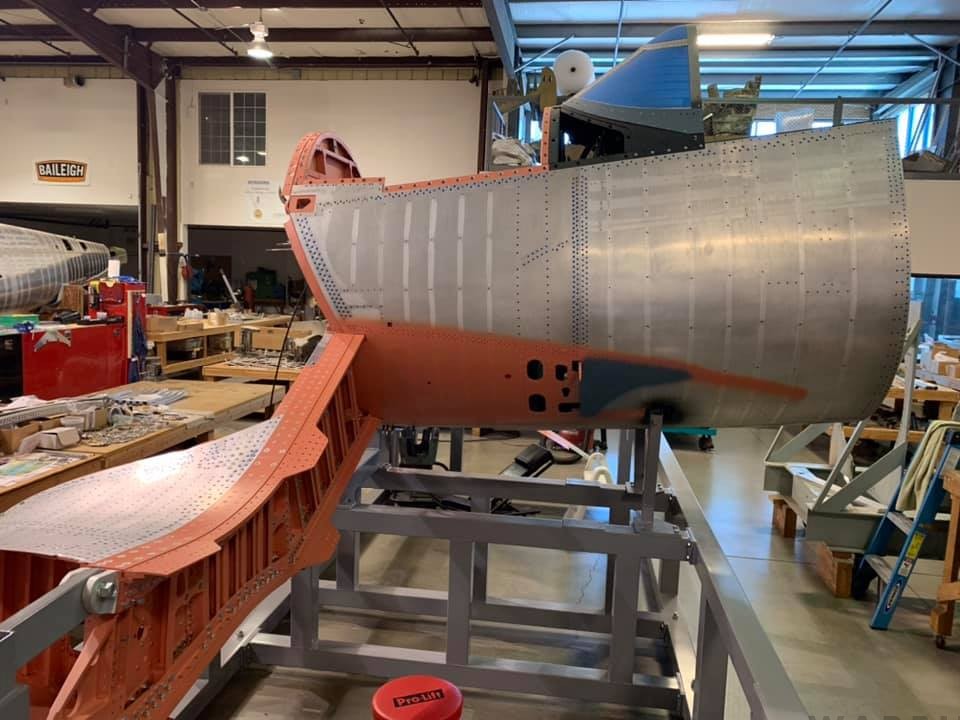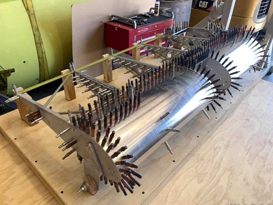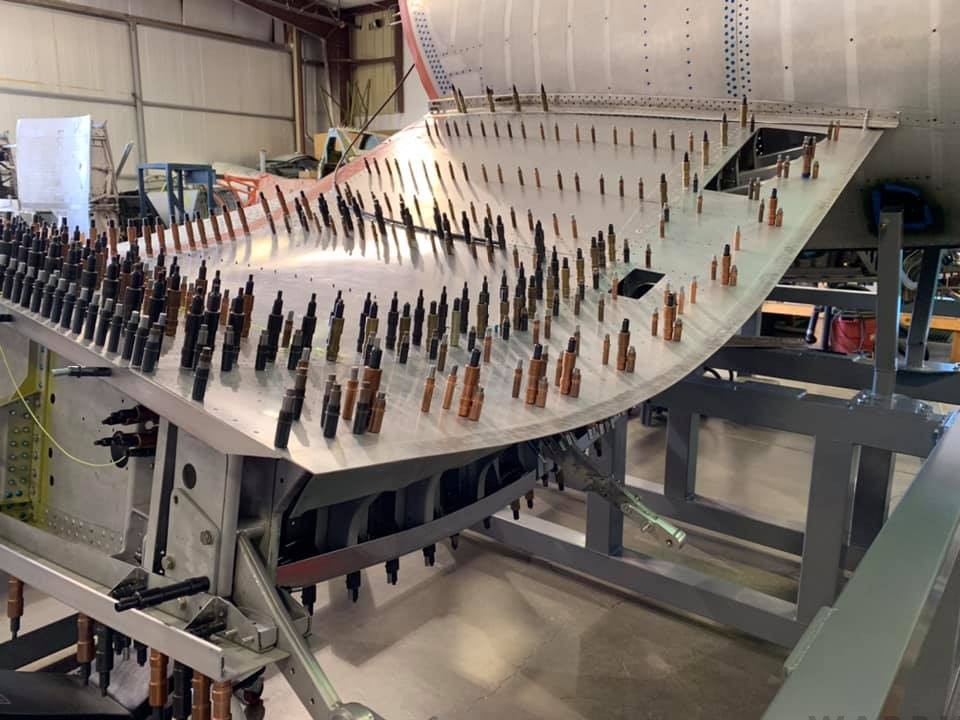 By May 2021, the entire center section was considered structurally complete, with work presently focused upon the flap spar area. The ‘Birdcage’ Corsair’s mid-fuselage section, like much of the aircraft, is unlike subsequent production models; it is undergoing assembly in its own jig, joining the nearly completed tail cone assembly. Vultures Row has manufactured new wing leading edge skins in-house on their Farnham roller and these are now in the process of being drilled to the early wet-wing sub-assemblies, also unique to early -1A and earlier Corsair production variants.