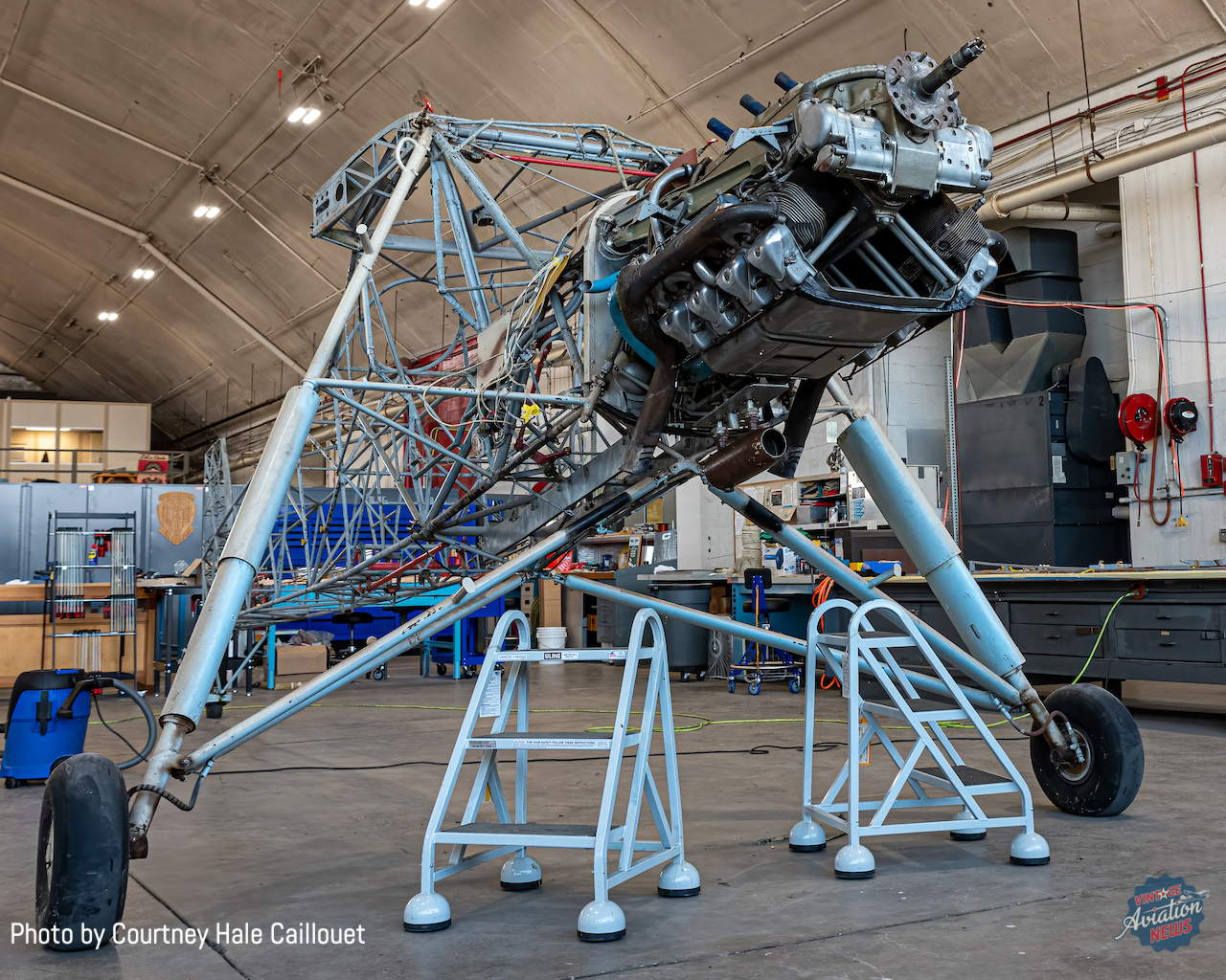 This article will be WarbirdsNews’ first concerning the B-17’s restoration, and we plan on frequent updates as the work progresses. As you would expect, the museum had first to prioritize planning for the aircraft’s arrival, so not a lot of actual restoration work has taken place just yet. However, museum staff stated, “After we got the fuselage into the Scott Hangar, one of the first tasks to be completed was removing all the windows. That was a quick and satisfying job. Floorboards and the top and chin turrets were also removed. A top priority now is building fixtures for the front and rear fuselage so we can split the fuselage at the production break behind the radio room. The two fuselage sections will be much easier to access and move around. Once the fuselage is split, we’ll get the paint stripped inside and out and then make a careful assessment of the condition. Our restoration team has made good progress on identifying and tagging loose parts. They’ve also been opening access panels on both the fuselage and wings for inspection purposes. One engine support fixture has been completed and the engine installed for both display and future restoration work. A second engine fixture is in progress.”