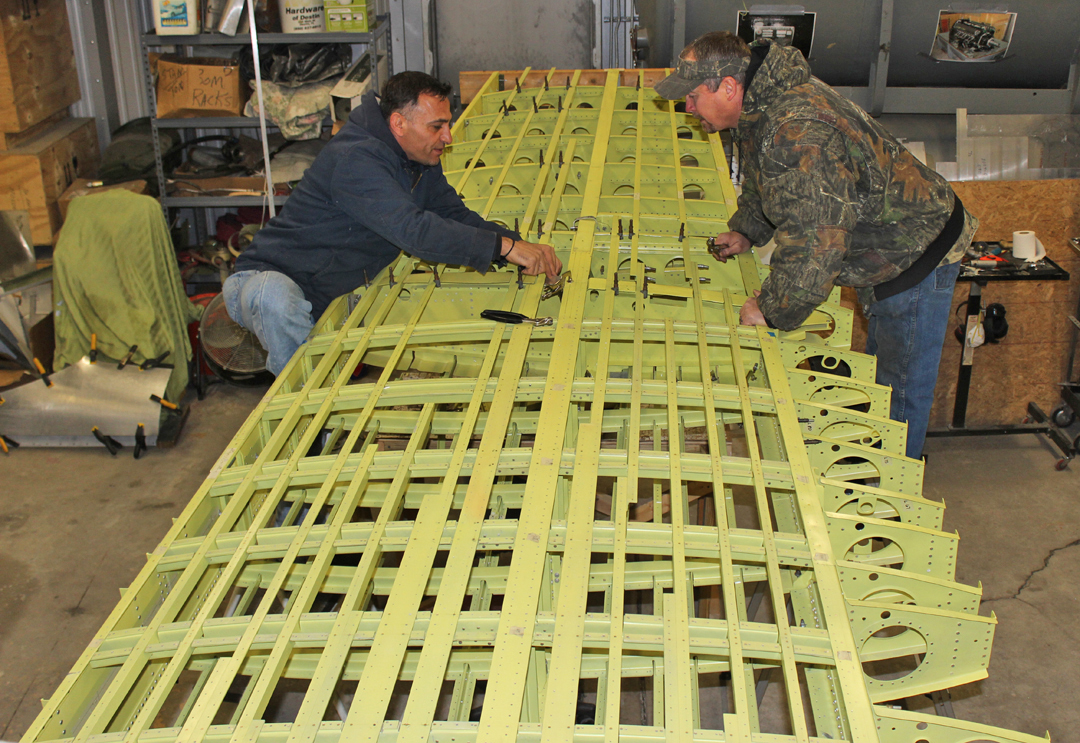Ayman, Tim, Paiden and Josh have completed all of the preliminary rib-to-stringer-to-spar drill-ups on the left-hand wing. They made all of the preliminary drill-ups with a reduced-size bit to allow a small amount of alignment adjustment, if needed, once the wings are in the assembly fixture.