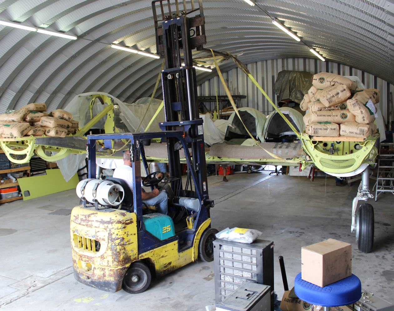 August 15th saw the team turn the fuselages/center section assembly 90º to the south in the hangar. Reilly and his crew hoisted the aircraft using the factory-mounted, 45° lift points on the center section’s inboard sides, right against the fuselage lower longerons. These lift points (¾-16 threaded ports) were designed to bear the weight of the entire aircraft, including engines, so were more than capable of handling the incomplete XP-82. In fact, the team was able to lift the entire, balanced center section with both fuselages and engine mounts with just one man lifting and guiding each rear fuselage. The lift and pivot operation took roughly two hours to reposition the aircraft so it will eventually be able to slide out of the large south-facing hangar door.