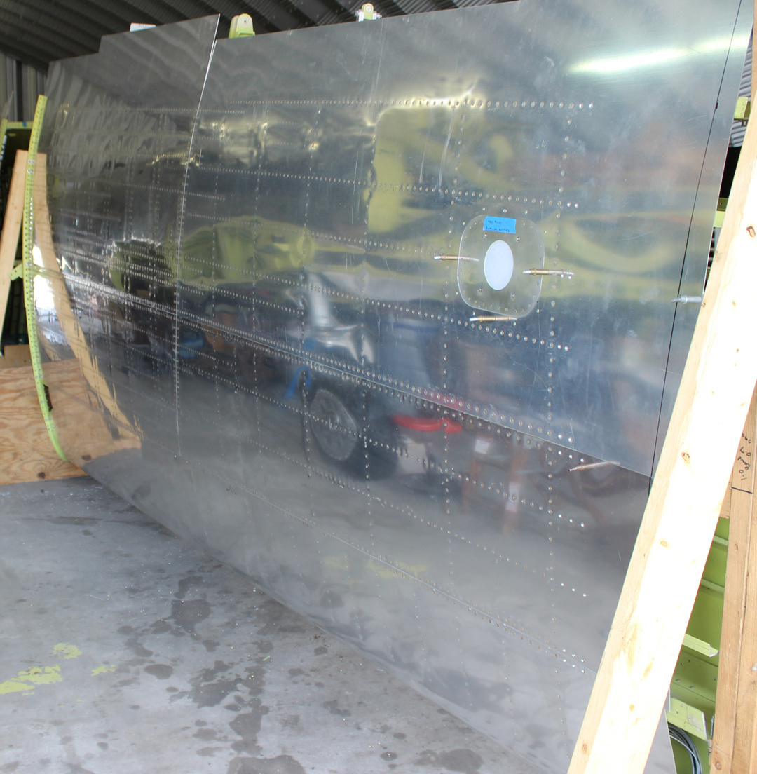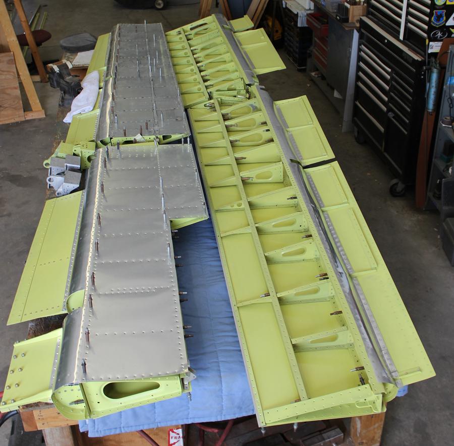 The restoration team completed riveting all of the outer wing panel top skins in place while the wings were still mounted on the fixture, along with one more bottom skin for each wing; locking the wings into their final shape.