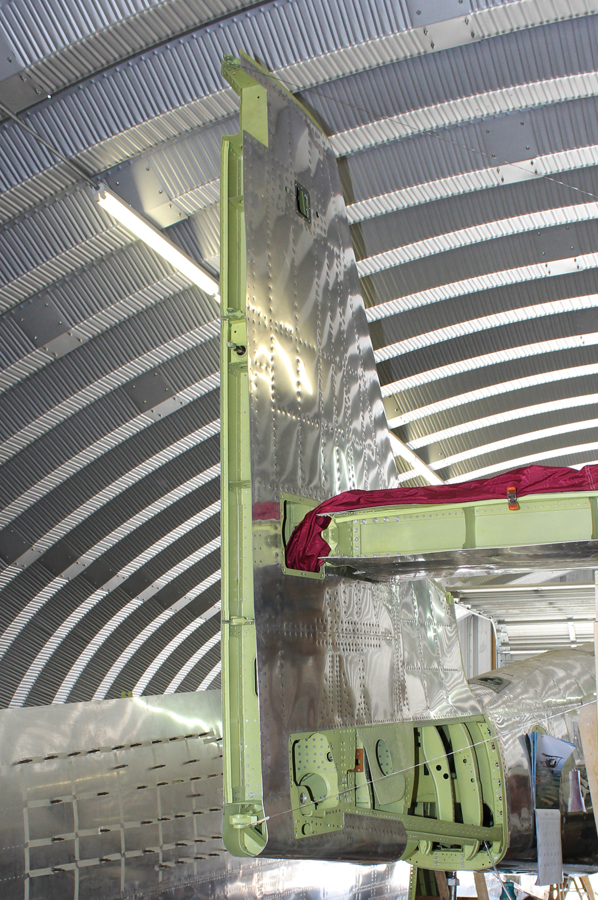 Reilly’s team then attached each vertical to its respective side of the horizontal stabilizer. They had to align and hold the verticals in a perfect 90º position in relation to the horizontal stabilizer. To achieve this, they used diagonal wires with turnbuckles to make the final tiny adjustments as the verticals are permanently held in place when the aft fuselages are high-shear riveted and bolted to the forward fuselages. A few days later, the team built a temporary cushioned wooden scaffold, and lifted the horizontal/verticals/aft fuselage sections up and forward to within ½” of their final attachment positions.