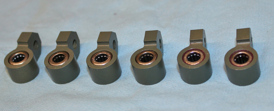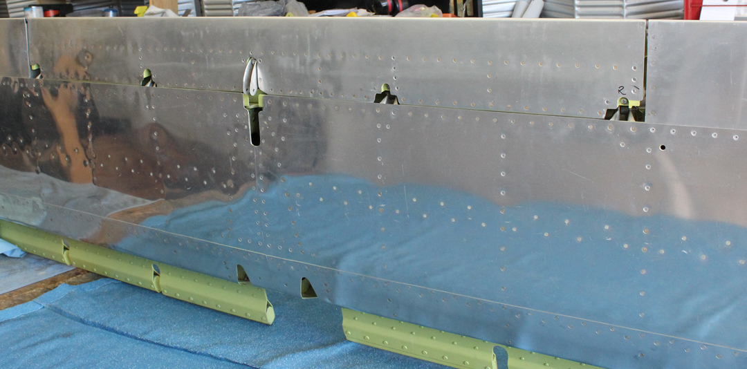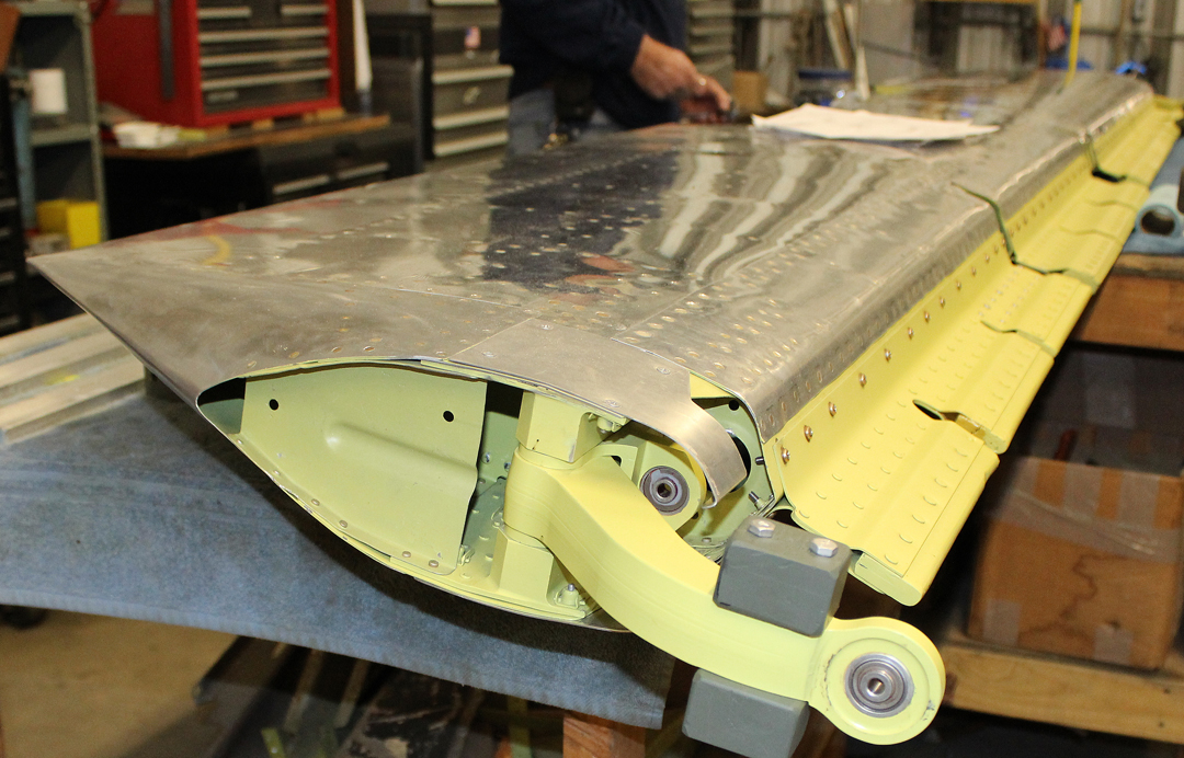 The four specially machined aileron hinge points are nearing completion at one of the project’s sub-contract machine shops. These are the main hinge point attaching-and-actuating fittings that connect the ailerons to the wing trailing edges.