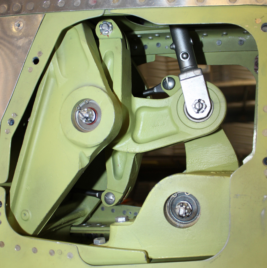 The up-lock mechanism for activating the gear door up-lock hooks is quite complicated with the amount of moving parts that it has, but very dependable. The mechanism is controlled by one hydraulic cylinder on each side mounted on the forward spar for the forward hook, and then transitioning all the movements through a number of bellcranks, push rods and levers to actuate each aft hook mounted on the center spar. Two team members have spent the entire month locating each casting (ten) that holds the bellcranks, etc. These bellcranks and mounts are all interwoven with the hydraulic lines and wiring harnesses. Pictures of the completed systems will be in next month’s update.