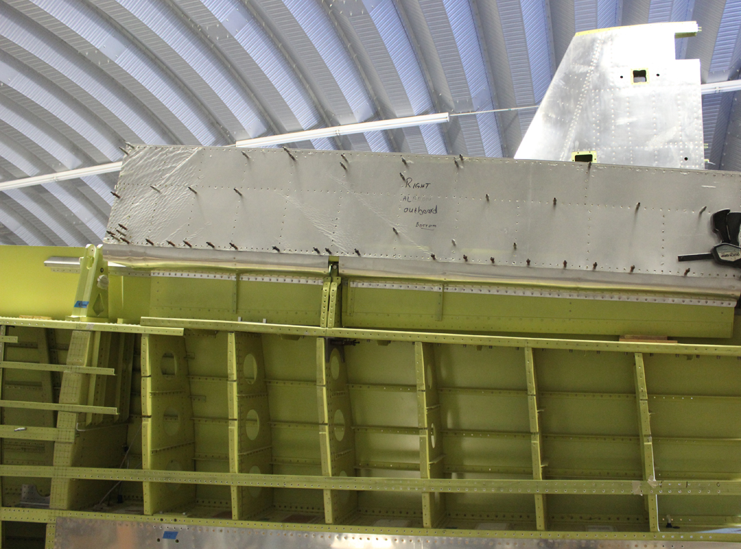 Fitting the ailerons to the XP-82’s wings is proceeding smoothly. This required the re-manufacture of new aileron hinge fittings on the four ailerons – the Twin Mustang has four ailerons, while the P-51 has just two – and all new hinge points that mount on the wings. Reilly’s team also had to machine the new gap seal extrusions that are on the upper and lower skins on the trailing edges of the aileron bays. Also, both of the outboard flap hinges are now complete. The engineers are fitting them on each wing.