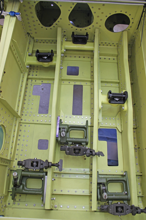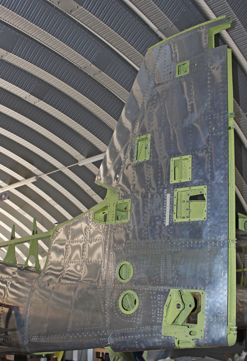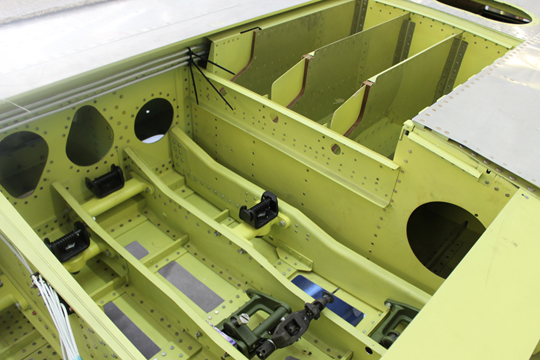 The final microscopic alignments and attachment of the aft fuselage extensions are complete, along with all of the primary and secondary flight control pulley brackets, many phenolic cable guides and the tail wheel attachments. The team is now into fitting the two dorsal fins on the top of the aft fuselages where they flare into the vertical stabilizers.