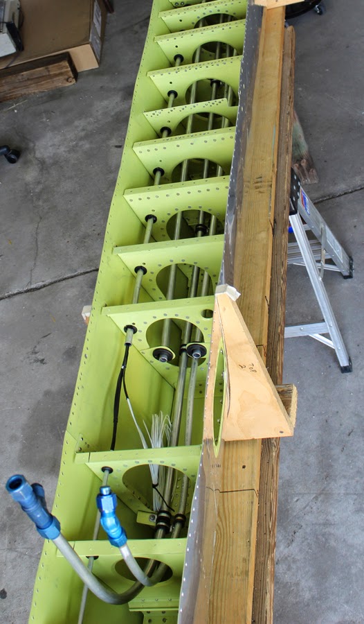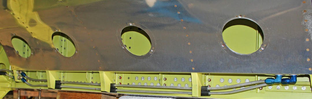 There has been just about a full team effort to complete the two outer wing panels. The team has finished the riveting for the leading edge sub-assembly, and installed all of the aluminum lines. These lines consist of electrical conduit tubes, aileron cable guidance tubes, pitot lines, drop tank pressure and return fuel feed tubes, boost pump, liquidometer, strobe, tip lights and pitot heat conduit tubes. The bottom inboard skins on the right hand wing are now completed awaiting the closeout panels.