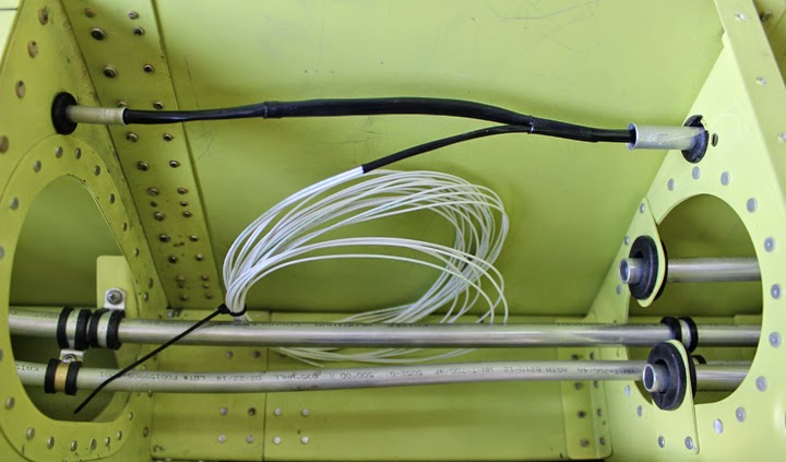 The team is close to completing the hydraulic and instrumentation lines for the two fuselages. There is a massive tangle of these lines running through the center section up through the floors and to both instrument panels. Along with this multitude of aluminum tubing, the team has been synchronizing all of the levers on both throttle and propeller quadrants. The static lines (neutral air pressure) are now fully installed, and the lines run to three locations; two in the left and one in the right fuselage.