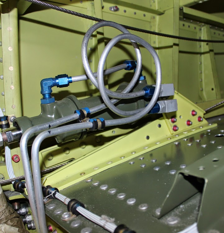 North American Aviation had a unique way of installing flexible lines on both the two main retract cylinders and the two flap cylinders. Instead of having a swivel joint, they just bent the hydraulic line(s) in a 360 or 720 degree flex circle, depending upon the amount of flexure that each cylinder would exert on the line.