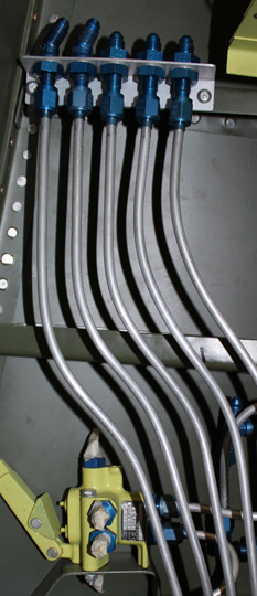 The team has also completed all of the flap hydraulic lines that run from the center section’s trailing edge and attach to the flap hydraulic cylinders that are mounted on top of the center section underneath both fuselages. The flap lines run from the flap hydraulic selector that is mounted aft of the left-hand center section wheel well to the center of the gun bay, then aft to the rear of the center spar. They then split and two lines on each side run out to the retract cylinders that mount to the underside of both left and right fuselages.
