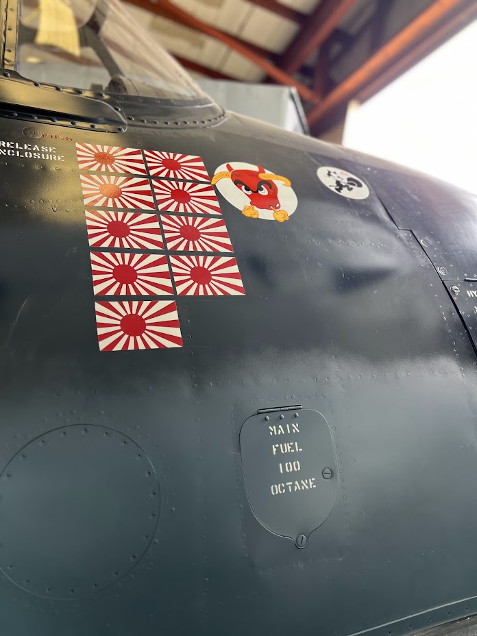 The scheme now present on the Yanks Hellcat is accurate to how the aircraft appeared on the deck of the Intrepid from January through February 1944, based on historical photographs taken of the aircraft and to notes that Vraciu himself had written to various researchers in the warbird community. The aircraft’s squadron number 19 appears on both the left and right sides of the engine cowling, landing gear covers, fuselage center section and on the vertical stabilizer. The camouflage scheme is the standard Tri-Color scheme applied to U.S. Navy and U.S. Marine Corps aircraft from 1943 to 1944, consisting of Sea Blue, Intermediate Blue, and Insignia White. On the cockpit section, the stencil “LT. A. VRACIU” appears underneath the cockpit canopy frame, while the nine Japanese flags represent the aerial victories made by Vraciu up to February 1944. Two unit emblems are also present on the aircraft; the Felix the Cat emblem used by both VF-3 and VF-6 when the squadrons switched their codes when Vraciu was serving under O’Hare appeared on both sides of the cockpit section, while a snorting bull similar to the one adopted by the Army Air Force’s 13th Fighter Squadron and the name “Gadget” appear on the right hand-side.