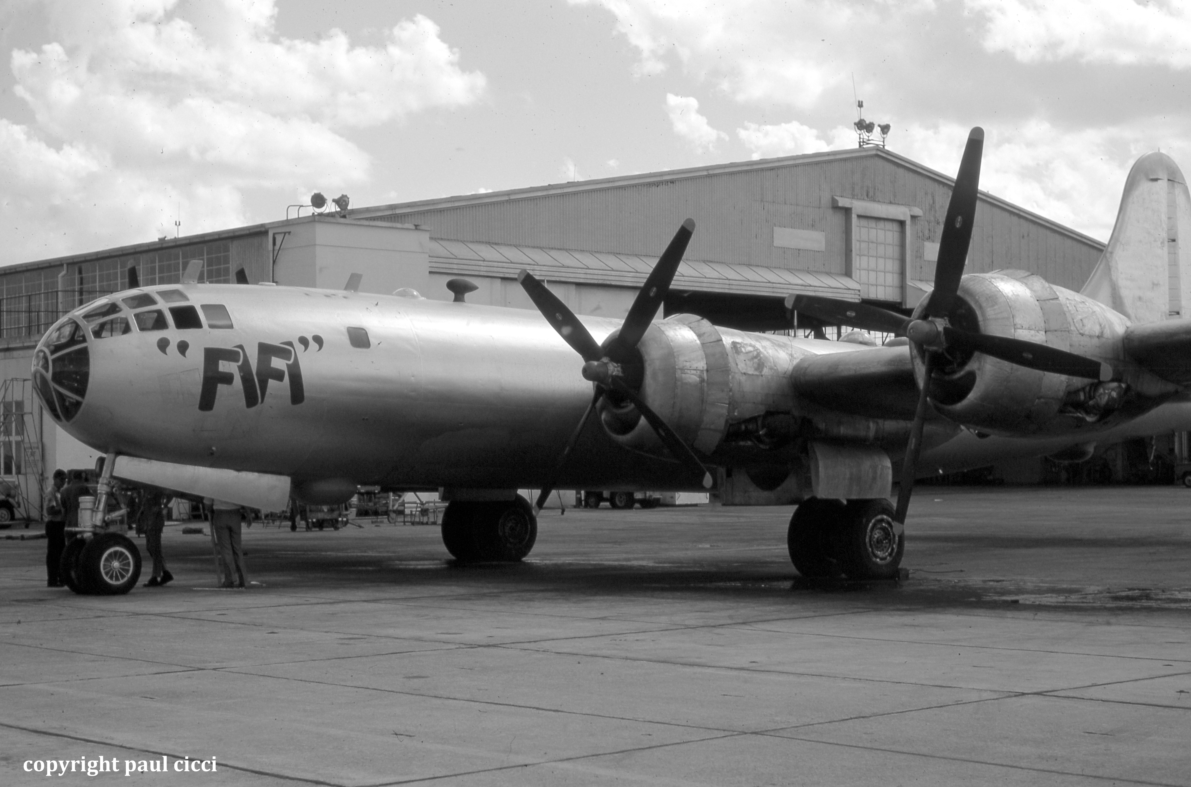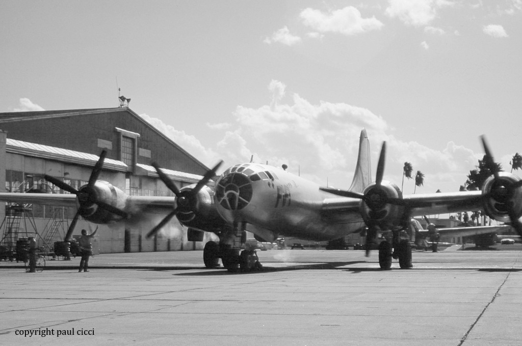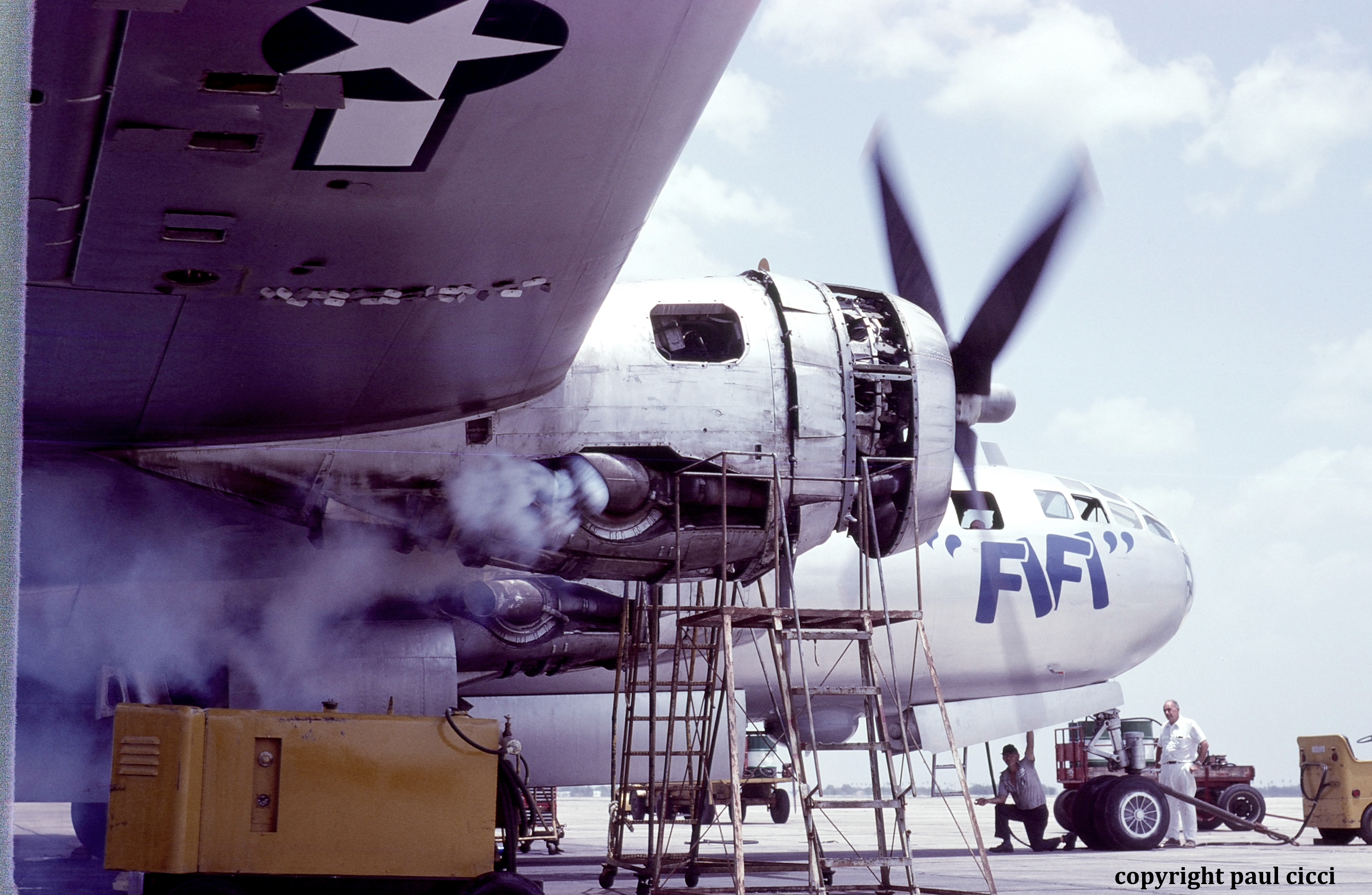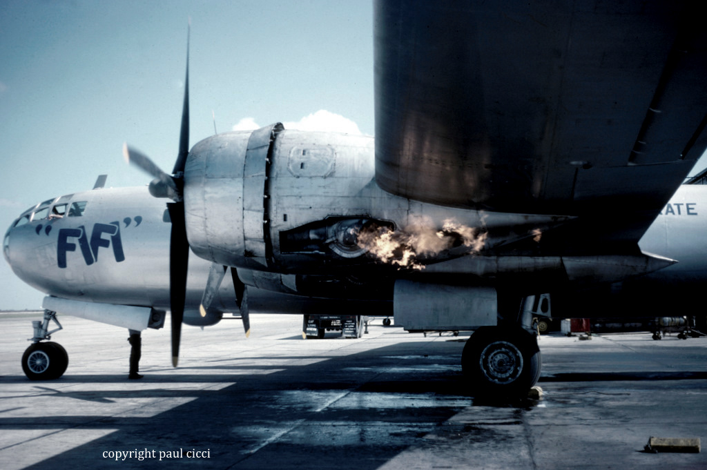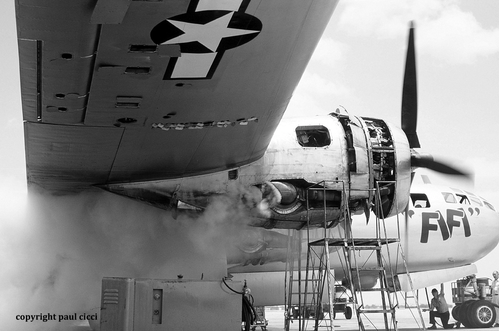 When I arrived at Rebel Field, I was assigned to work on the B-29 bomber “FIFI” This aircraft was going through a heavy maintenance check and engine change-out. I thought this would be an excellent chance to photograph maintenance on “FIFI” and little did I know there would be interest in my photos taken at the CAF 40 years later. During breaks and lunch, I would wander the base photographing planes, parts, and people. Some of the maintenance personnel were retired US Air Force while others were younger A&P mechanics learning the business of maintaining WWII aircraft from personnel that worked on these very aircraft in the service.
