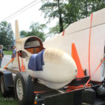 Starting around 8:00 AM, volunteers worked with pulleys and come alongs to carefully remove sailplane, which was filled with Mud Dauber nests from its decades of storage. The wings had been carefully stored in cradles on the second floor. The fuselage was hung from the beams of the third floor using large fan belts which had deteriorated over time. Soon enough, the sailplane was out of the mill, which had snakes hiding amongst its original equipment, and was being loaded on a trailer to head to it’s new home before noon.