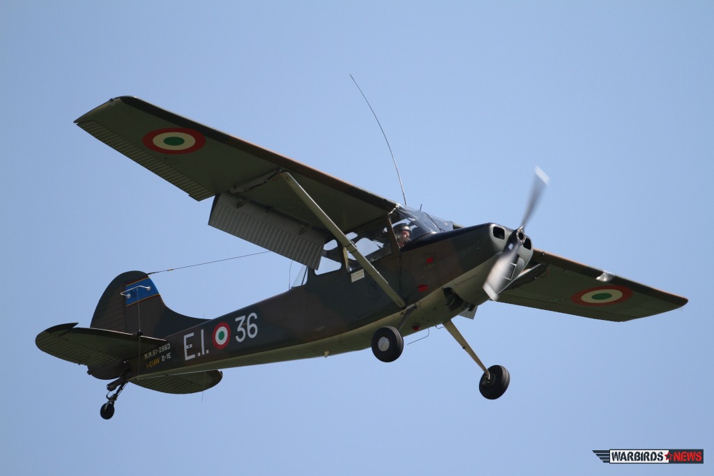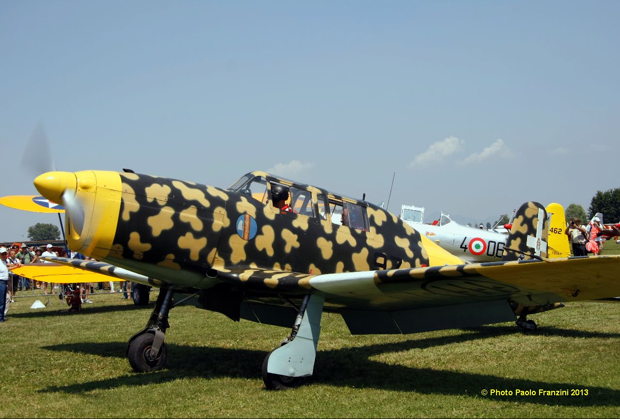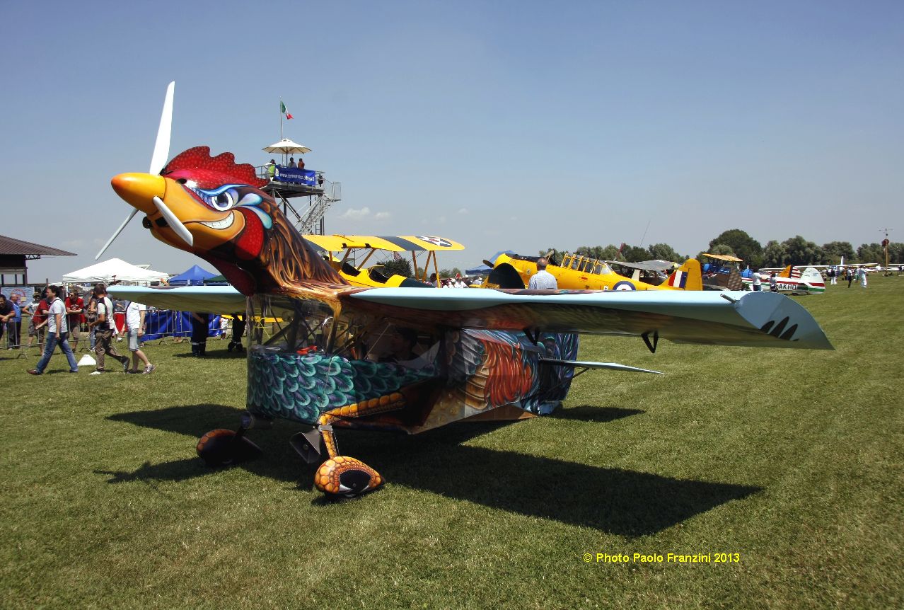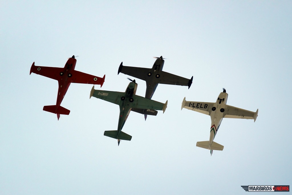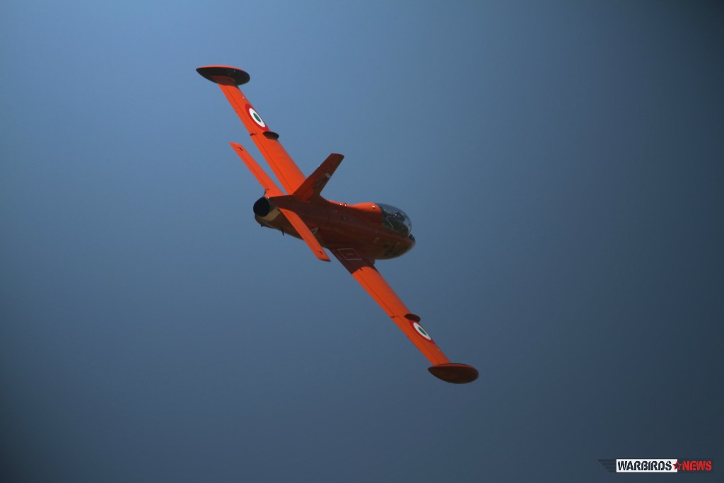 It would be impossible to list in detail all the participants of the event, but we want to mention in particular the highly appreciated performances of the The Swiss Pilatus Warbird aerobatic team, the P-3 Flyers and their Pilatus P-3s, the Blue Voltige aerobatic team in their Fournier RF-4s. The North American T-6 Texan piloted by Sandro Pagliarin gave a memorable performance if only for the ducking he caused when he decided to overfly the crowd decidedly “low,” leaving everyone wondering if their hair had been unexpectedly trimmed. Andrea Rossetto, the President of HAG, flew the Macchi MB.308, fresh from Le Bourget, where they were participating as part of the Alenia Aermacchi 100th anniversary exhibition at the Paris Air Show. Also of note was the weird and wonderfully improbable Aerogallo flying rooster plane. Another surprise guest was Renzo Catellani flying his Aermacchi MB.326 I-RVEG who decided to fly in for the party on his way home from the “environment-killing” Airpower Air Show in Austria, it was a real treat to see in person and in the air, the iconic plane on which Warbirds News recently reported.