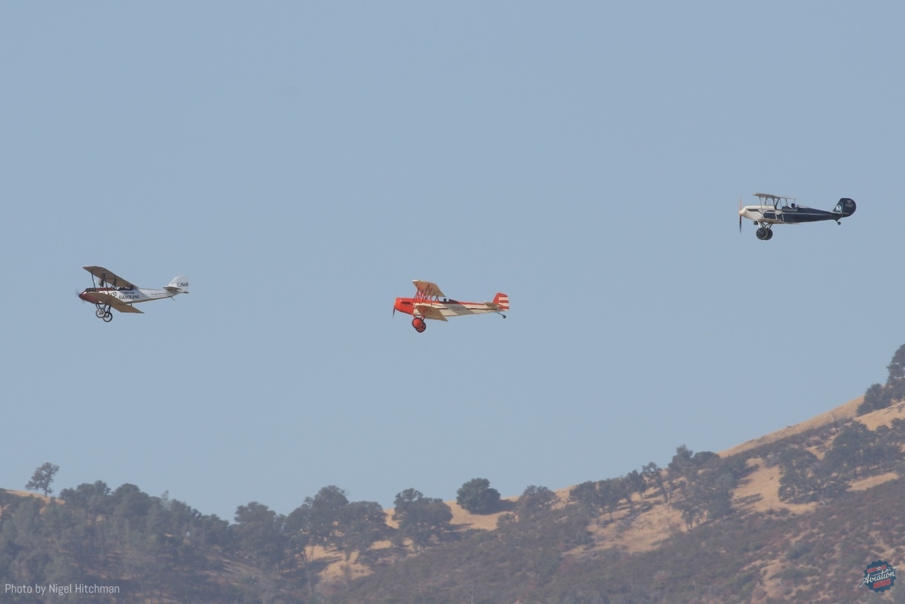 In addition to multiple OX-5s, three Wright J-5 powered aircraft also flew together—something that likely hasn’t happened in decades. The Stearman C3 NC6438 departed late, so initially the Waco ASO NC1826 and Travel Air 4000 ‘4264’ flew in formation. When the Waco developed a minor issue and landed, the Stearman joined up with the Travel Air for another pass. The Waco was later fixed and flew again.