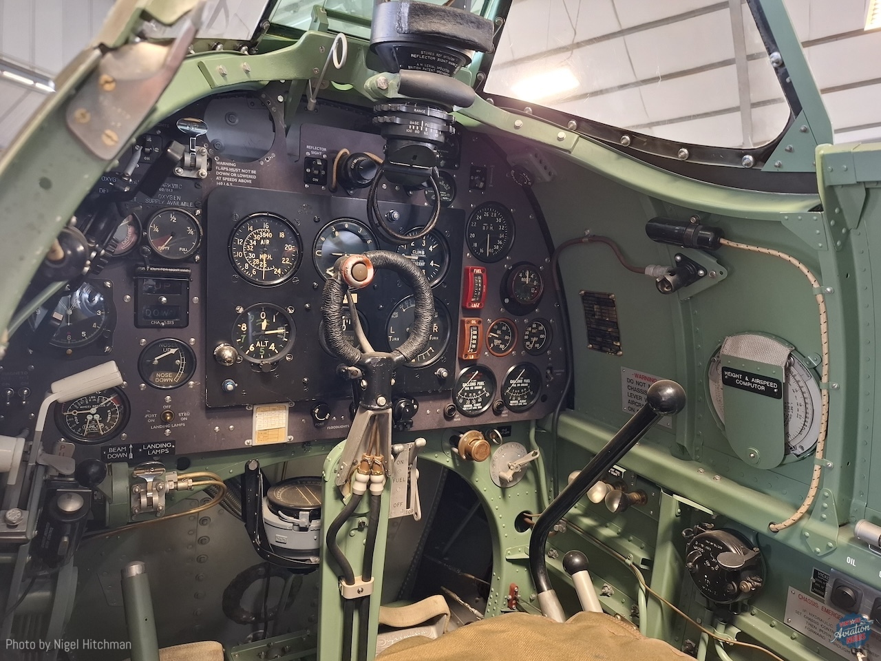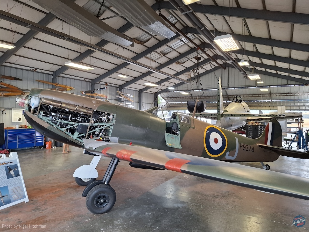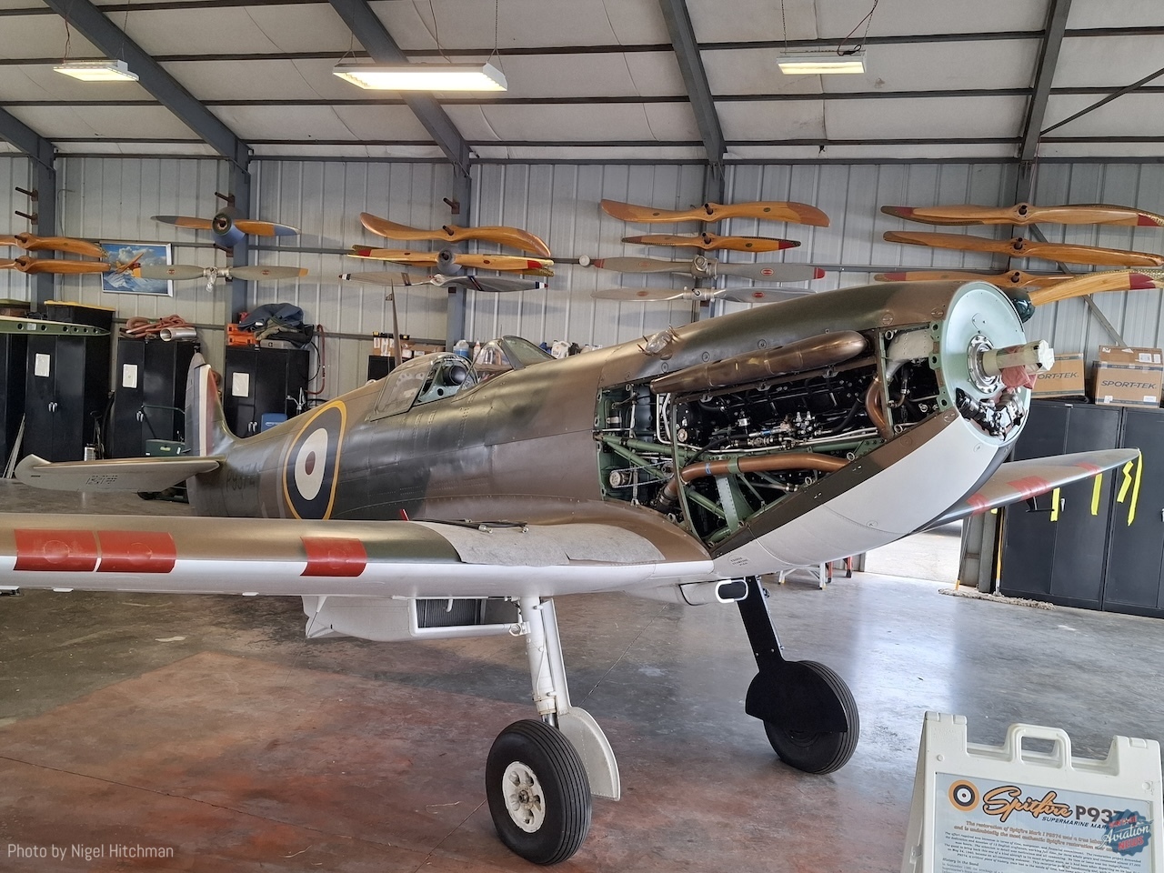 The Spitfire IA P9374 is well known, having been restored and flown at Duxford from 2011 to 2017 as G-MKIA. It was later bought by Ron Lauder on Long Island and registered N92SQ. The aircraft saw limited flying before being put up for sale with the rest of Lauder’s collection in 2024. Initially planned to fly back to California, the aircraft required significant work—including a cracked spinner—so it was dismantled and shipped to Ala Doble. An electric fuel pump and brake repairs are currently underway, with hopes for a flight this winter.