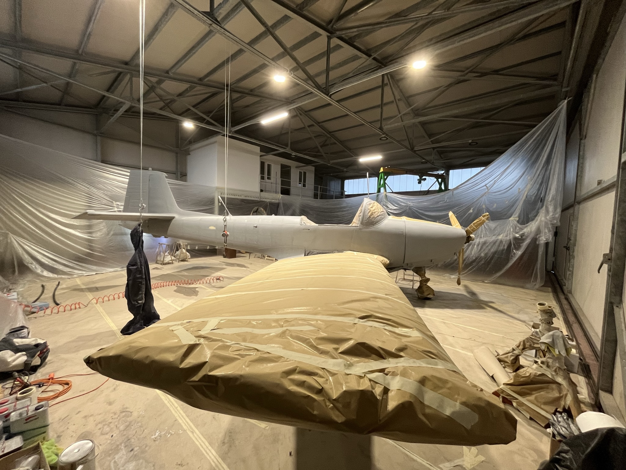 Eventually, the airplane was fully prepped for the paint booth; however, there was no paint booth available nearby. Captain Gusso told us, “We built a beautiful 15 x 15 x 5-meter booth inside the hangar using wood and plastic sheets!” After four months of work, the Piaggio was finally flight-ready.