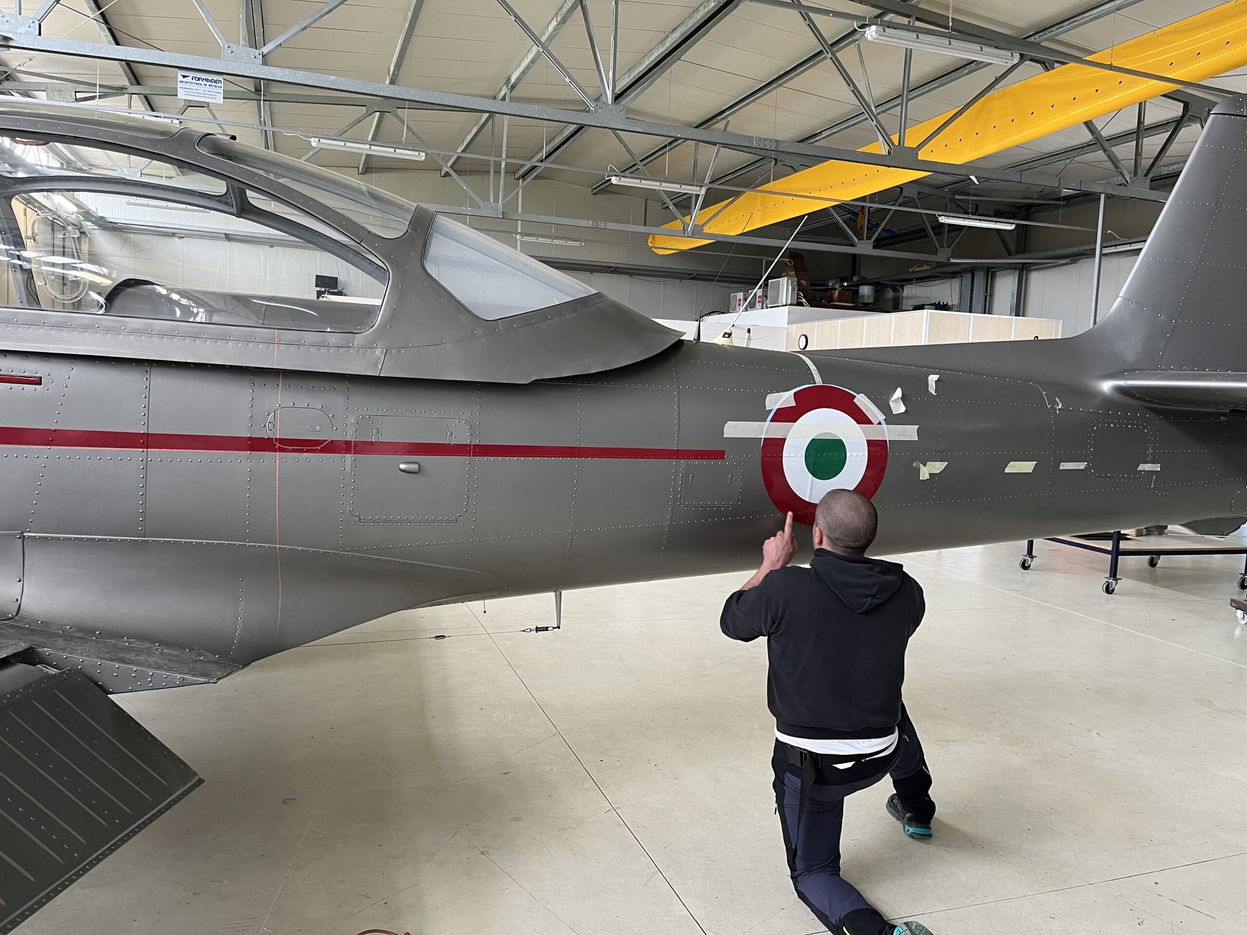 Captain Gusso finally found the airplane that checked all the boxes in July of 2021, but it, too, had a major flaw: an almost unwatchable civilian livery. Captain Gusso told us: “I evaluated a series of proposals from aircraft painting companies, but they were definitely too expensive for my pocket. I evaluated others abroad but due to logistical travel and language barrier problems, I had to give up. So I started to entertain the idea of doing things on my own as soon as I retired.” The Captain started looking for a hangar near Caorle (Venice), his hometown, where he could do the long cosmetic operation without having to dismantle the plane. After a tedious search, he eventually found one.