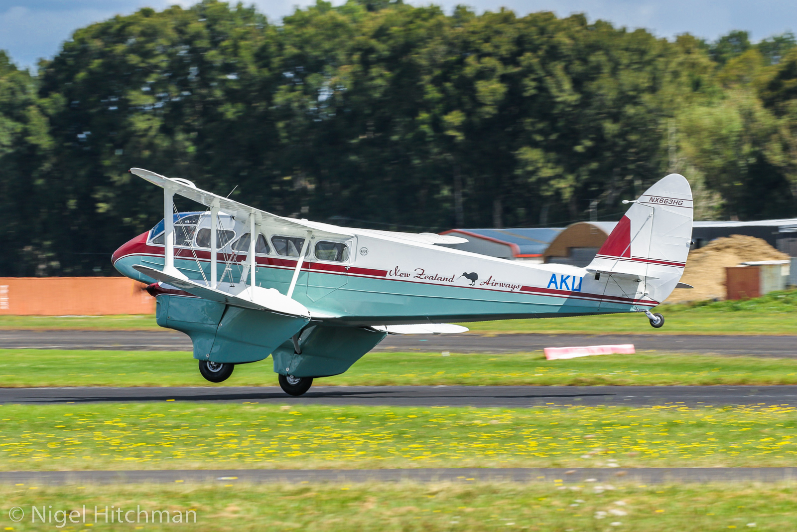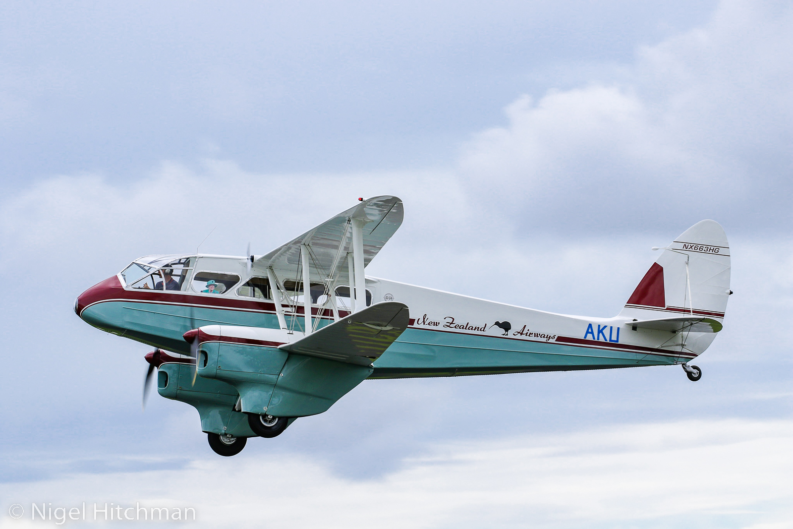 Dragon Rapide ZK-AKU performs a flyby down the runway. (photo by Nigel Hitchman)