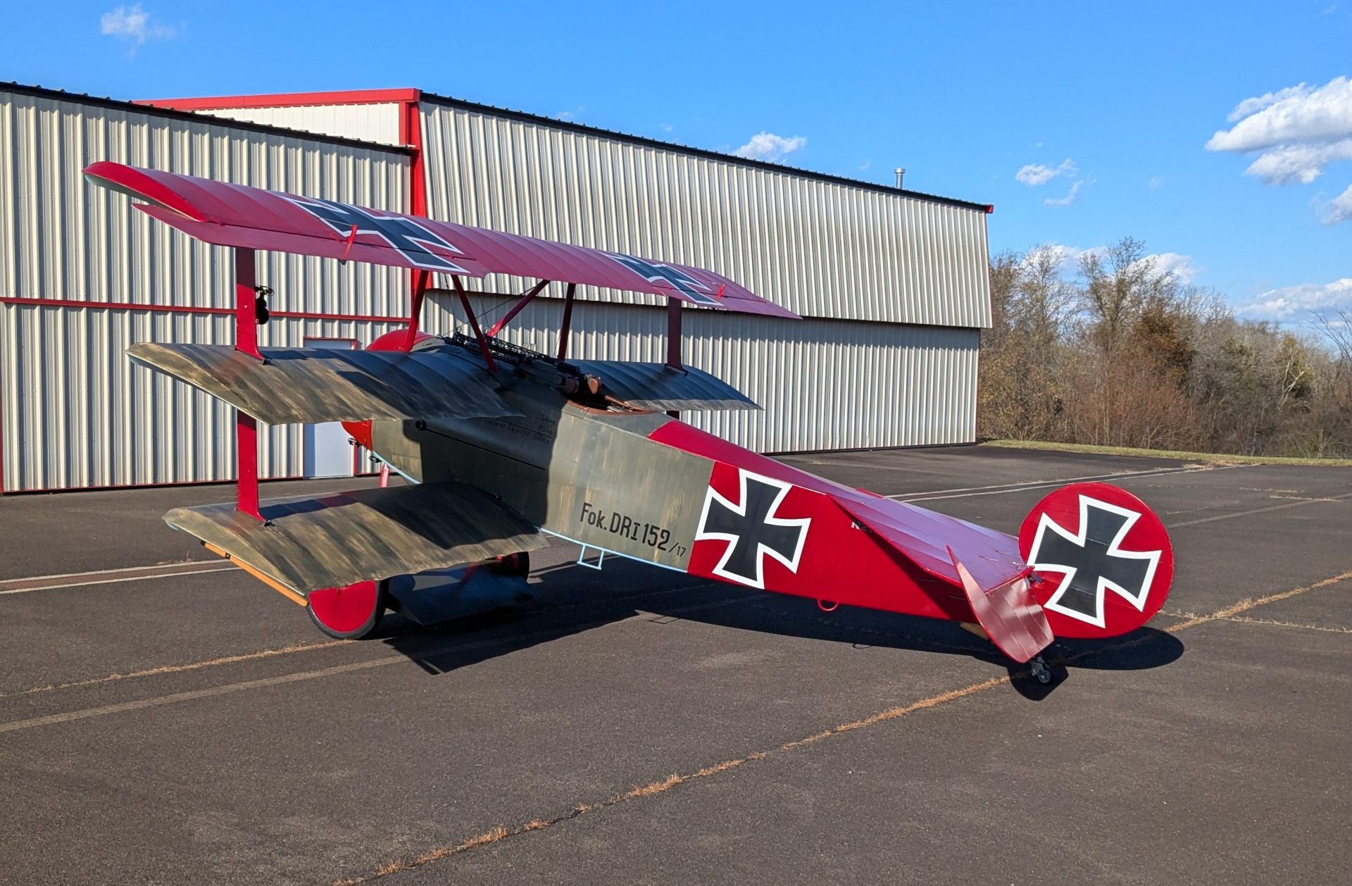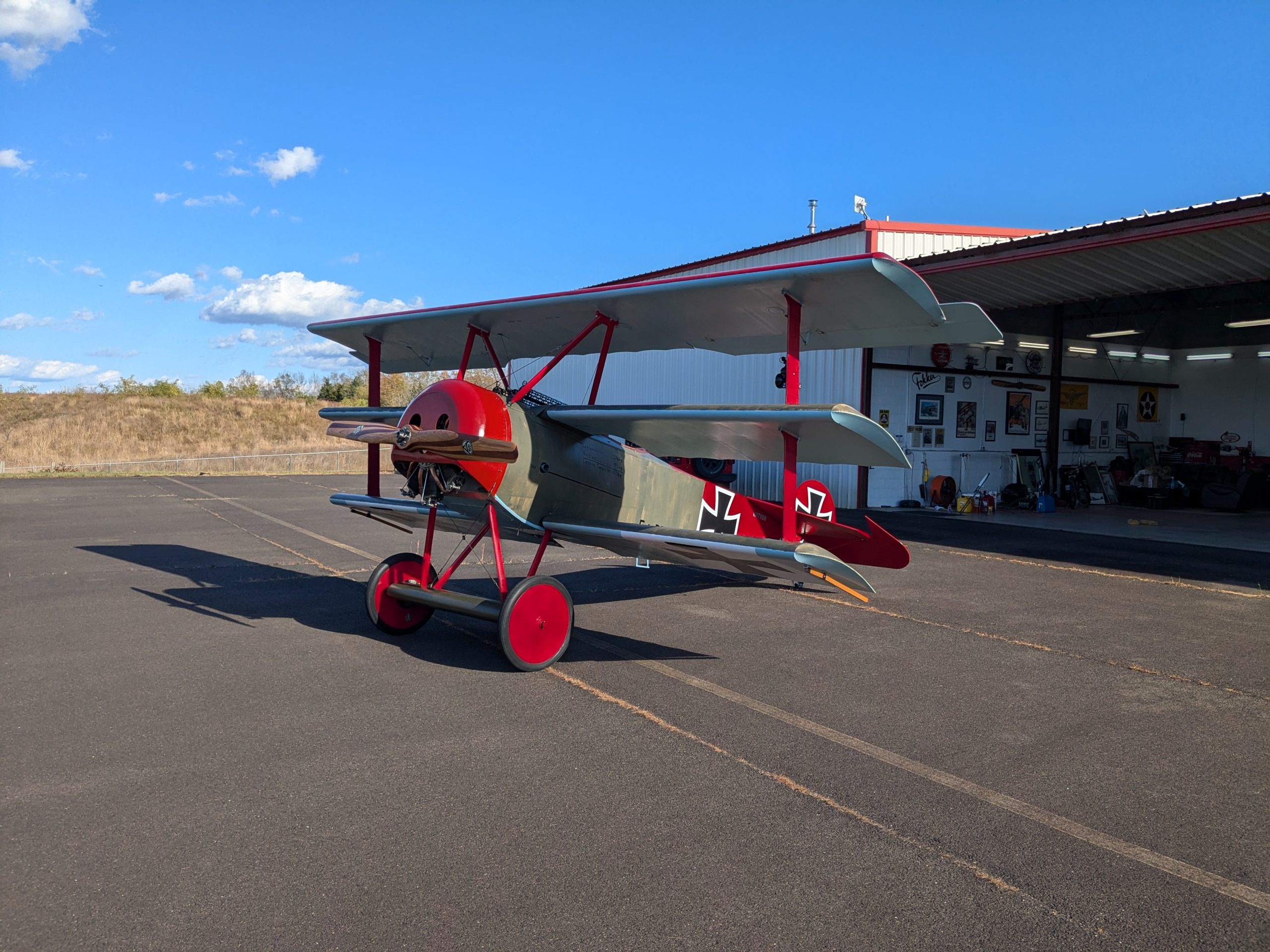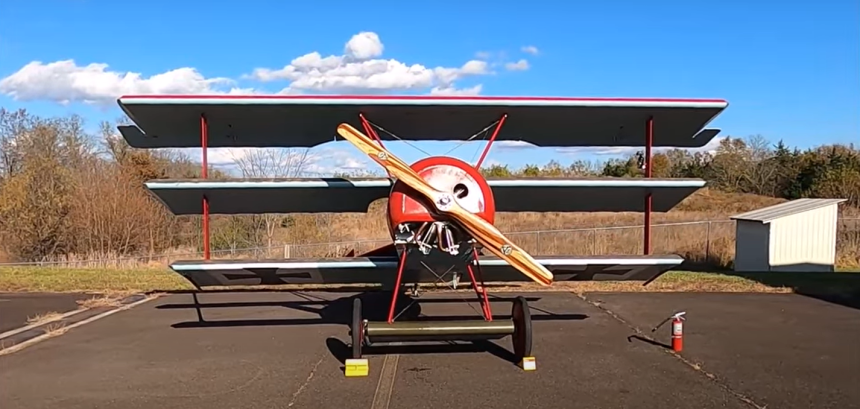 John Elliot’s Fokker Triplane at Warrenton-Fauquier Airport in Virginia has succesfully been installed with a 1918 LeRhone rotary engine, which had not run since November 12, 1918, and which had never before been mounted on an airplane before now. The engine was found a number of years ago still in its factory crate, complete with tool set and a three page record log. John bought the engine last year and sent it to rotary engine specialist Fred Murrin in Pennsylvania for rebuild, who also built the engine mount, fuel/oil tank, and new cowling, and did the installation in John’s existing airframe.