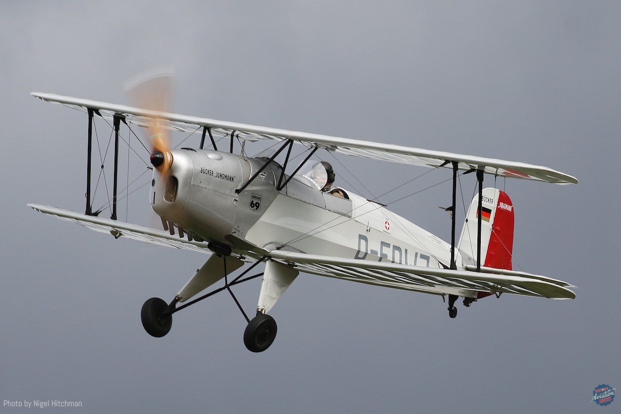 Antonov AN-2s were also popular, with four attending this year. Three Bücker Jungmeisters (D-EIII, E-EJJI, OE-AKT) and over ten Bücker Jungmanns were present, along with Egyptian-built Heliopolis Gomhouria examples, licence-built from the Zlin 381. Sadly, the unique Bücker Student from Biennenfarm near Berlin was unable to attend due to weather.