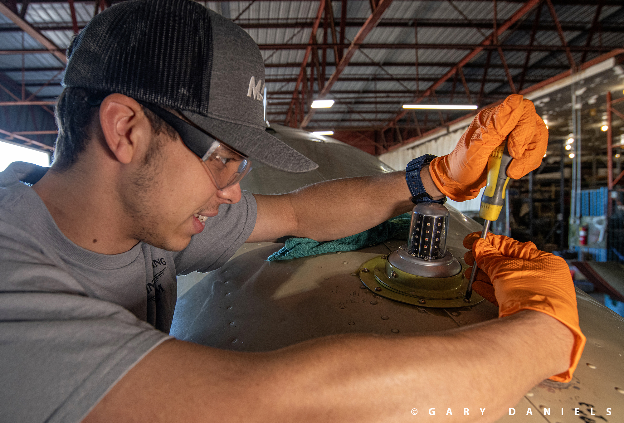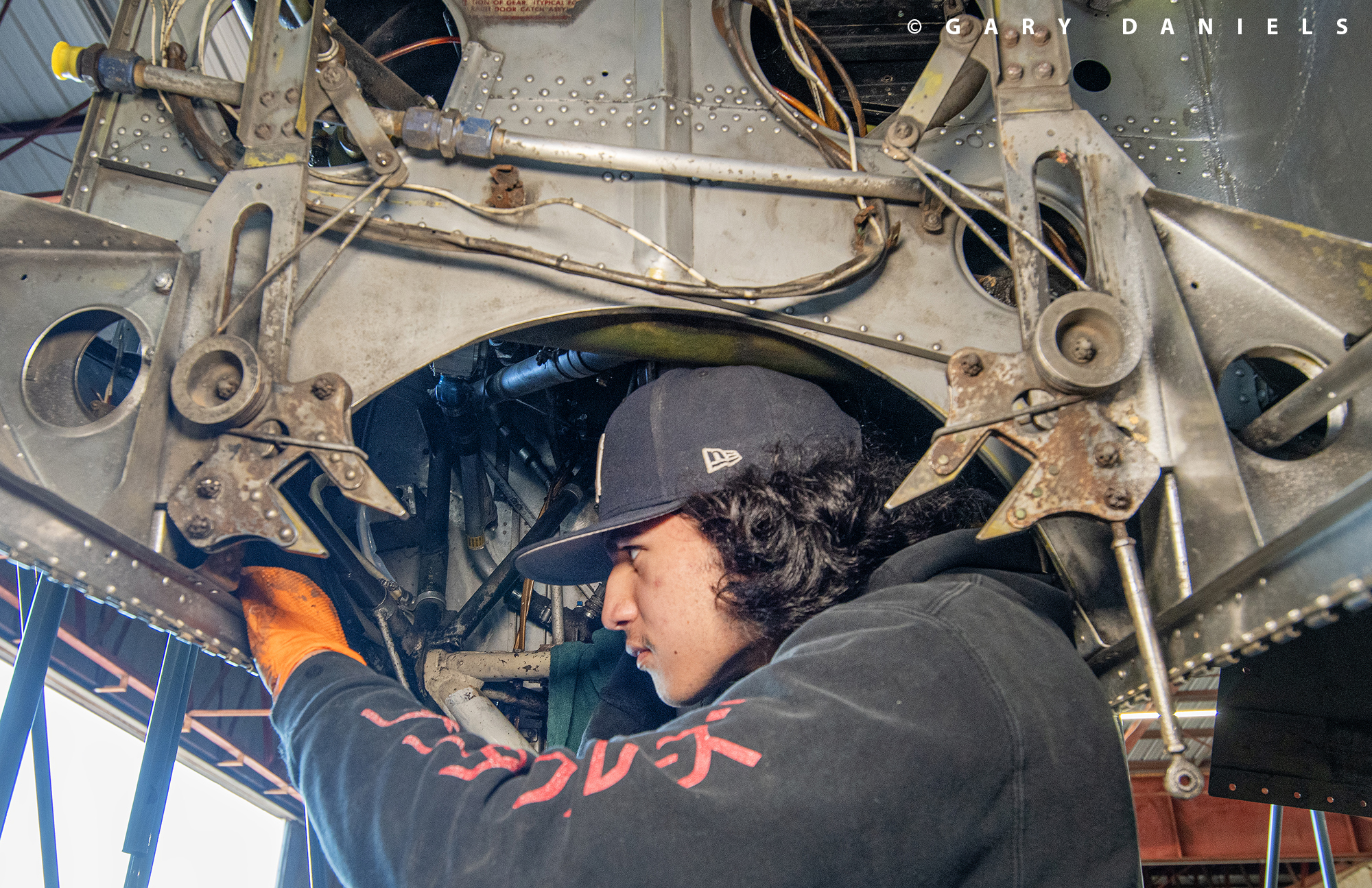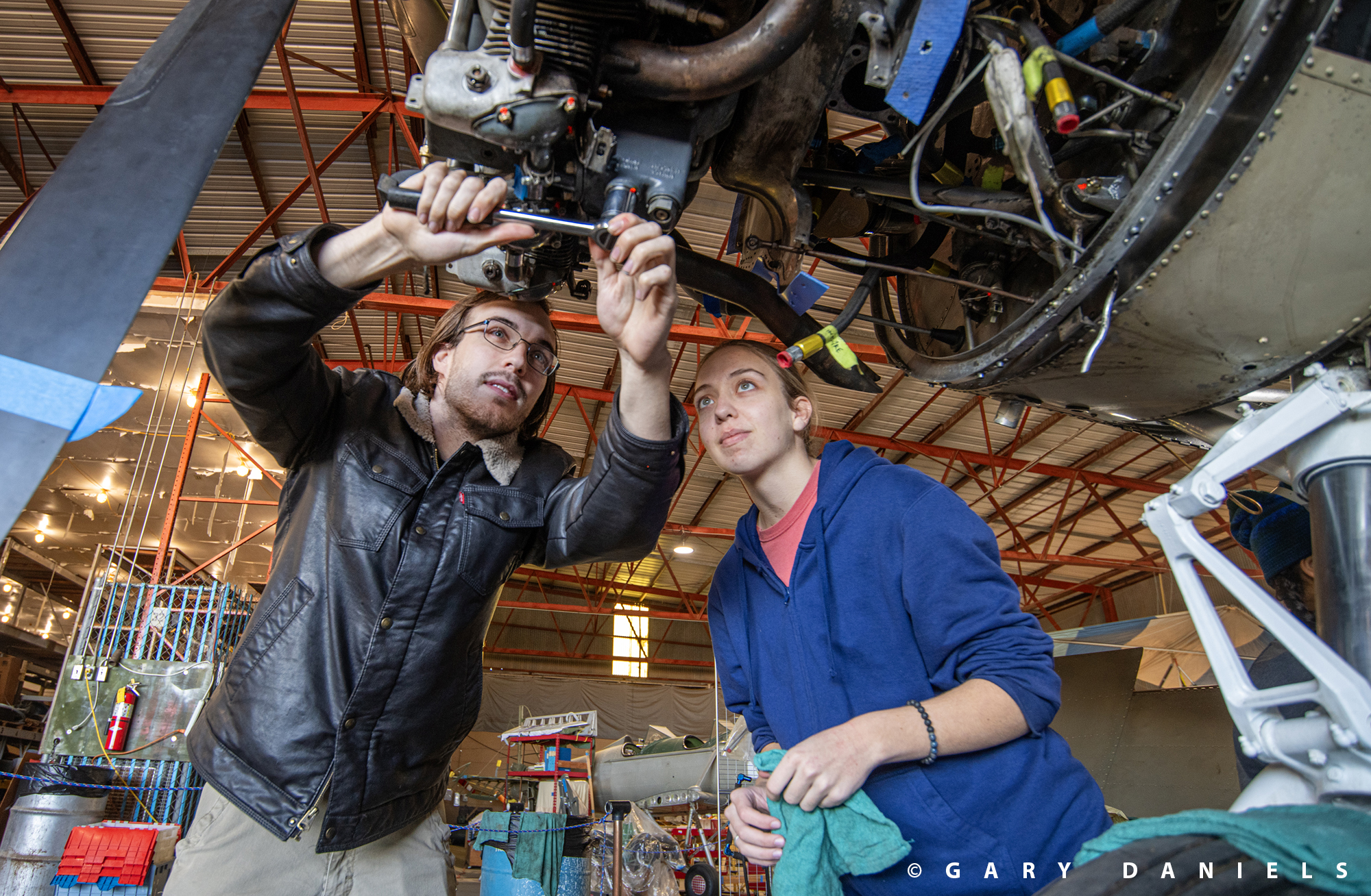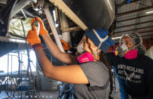 As Bill made his rounds, he checked in on mother and daughter, Serah and Miriam McMickle, and Sebastian Fernandez as they were cleaning, sanding, and priming the right and left wheel well interiors. Then, he instructed brother and sister, Benjamin and Grace Lewis, on how to install a new chip detector sensor on the left engine. Up an airstair, he darted to check in with Isaac Thompson, as he was installing a navigation strobe on top of the fuselage. Bill’s leadership of the restoration team is keeping the project on schedule and the volunteers enthused and motivated.