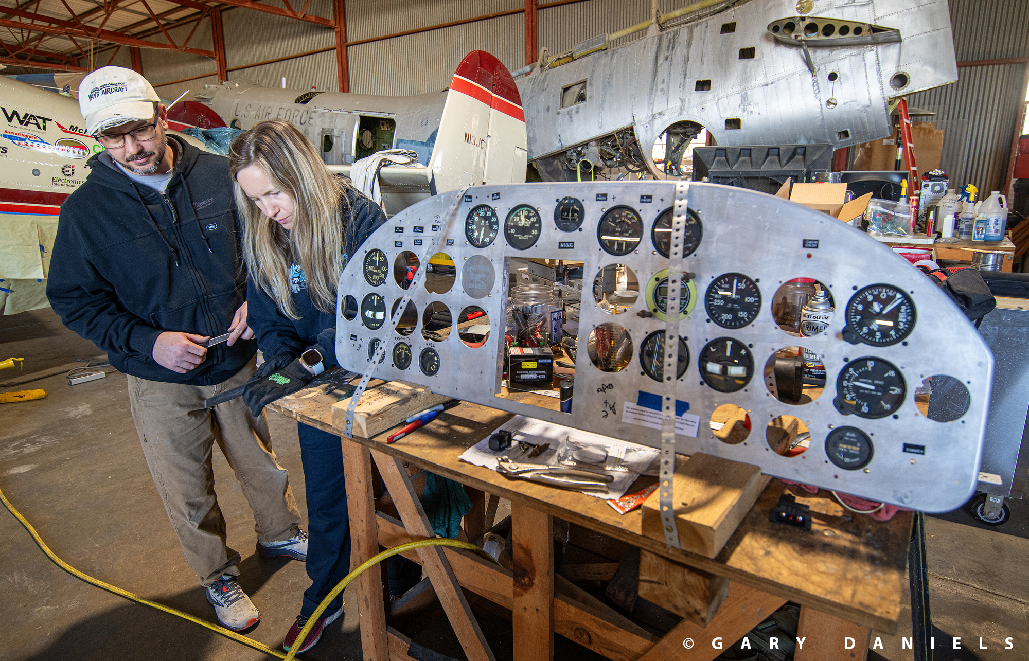 Enter Bill Goebel, owner of Vintage Aircraft Services in Rhome, Texas. Bill was asked by VFM to manage the restoration. He eagerly accepted the project as a volunteer. Since August 2022, Bill has overseen a large and eclectic team of museum staff and local volunteers. His extensive knowledge, friendly nature, and enjoyment of teaching create a positive energy among the volunteers as they tackle the long list of restoration challenges. I witnessed Bill’s jovial and patient leadership when I visited VFM in early December for an update on the project for this article. For example, Bill was guiding the husband and wife team, Joey and Katrina Lorenzen, as they were hand-fabricating the new instrument panel. A new panel is needed since legacy avionics had to be removed, the instrument layout rearranged, and space was created for the new Garmin GTN750/GNC255 avionics and GI275 displays.