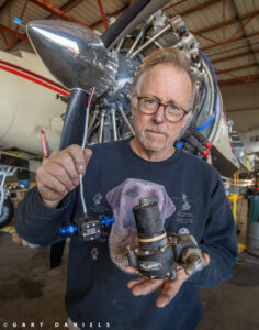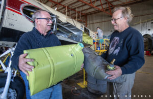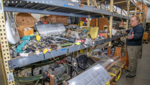 Bill motioned for me to come and see the racks of worn parts, ancient avionics and autopilot components, wire harnesses, and dead instruments that had been removed from the aircraft. There was even an old 8-track player in the discard pile! Bill held up a modern fuel flow transmitter next to its 1950s equivalent. The size of the new sensor is a quarter of the size and weight of the old unit. Bill said, “Modern avionics and electrical replacement is where we will see much of our weight savings.” The restoration team has a wager in play as to how much weight will have been removed from the aircraft when the project is completed. Currently, the bets are in the 200-300lb range.