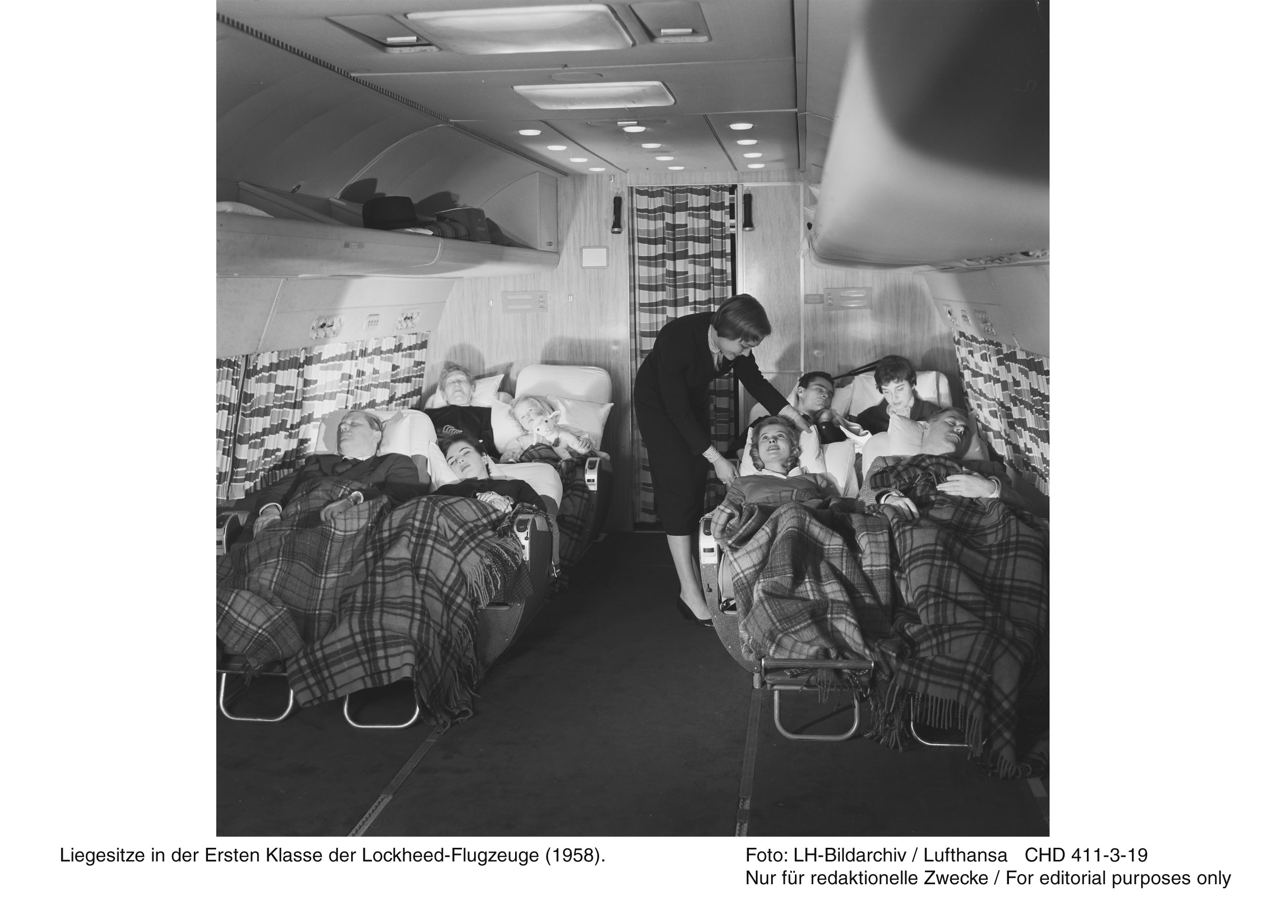 In addition to ‘Comforette’ First Class seats, an on-board lounge awaited passengers during the flight for ‘a twaddle, fancy games or a serious business talk’ according to a period Lufthansa brochure. Of course this was the 1950s, an era before present-day gadgets like earphones and personal, individually programmable video screens. In the bygone ‘golden’ propeller age, talking with the crew and fellow travelers, watching the passing clouds out of the windows and fine dining were the only ‘in-flight entertainments’ available. Comfort was the byword. Apart from fully reclining seats, there were also sleeping berths that folded down from the cabin ceiling during night flights. The Lufthansa Super Star carried a maximum of 32 premium passengers all of whom were pampered in its exclusive all First Class cabin.
