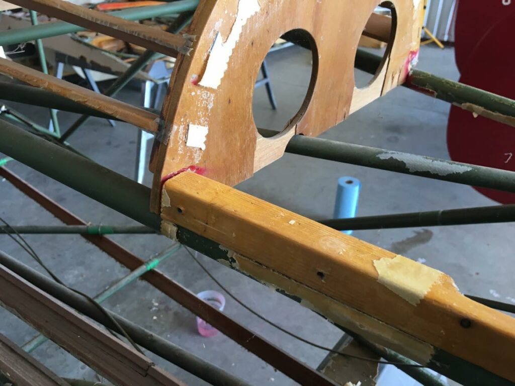 The airplane was damaged in multiple landing mishaps during the Bach years, all discussed in “Biplane” and “Nothing By Chance”. The Wayne Amelang restoration corrected the hastily done “field repairs” from the Bach years. All repairs – hasty or otherwise – to the wood components have been “erased” with all new wood. The repairs to the gear have been revisited and are fine. There were a couple repairs to the fuselage frame that have been “erased” by new lower longerons and a some other new tubes.