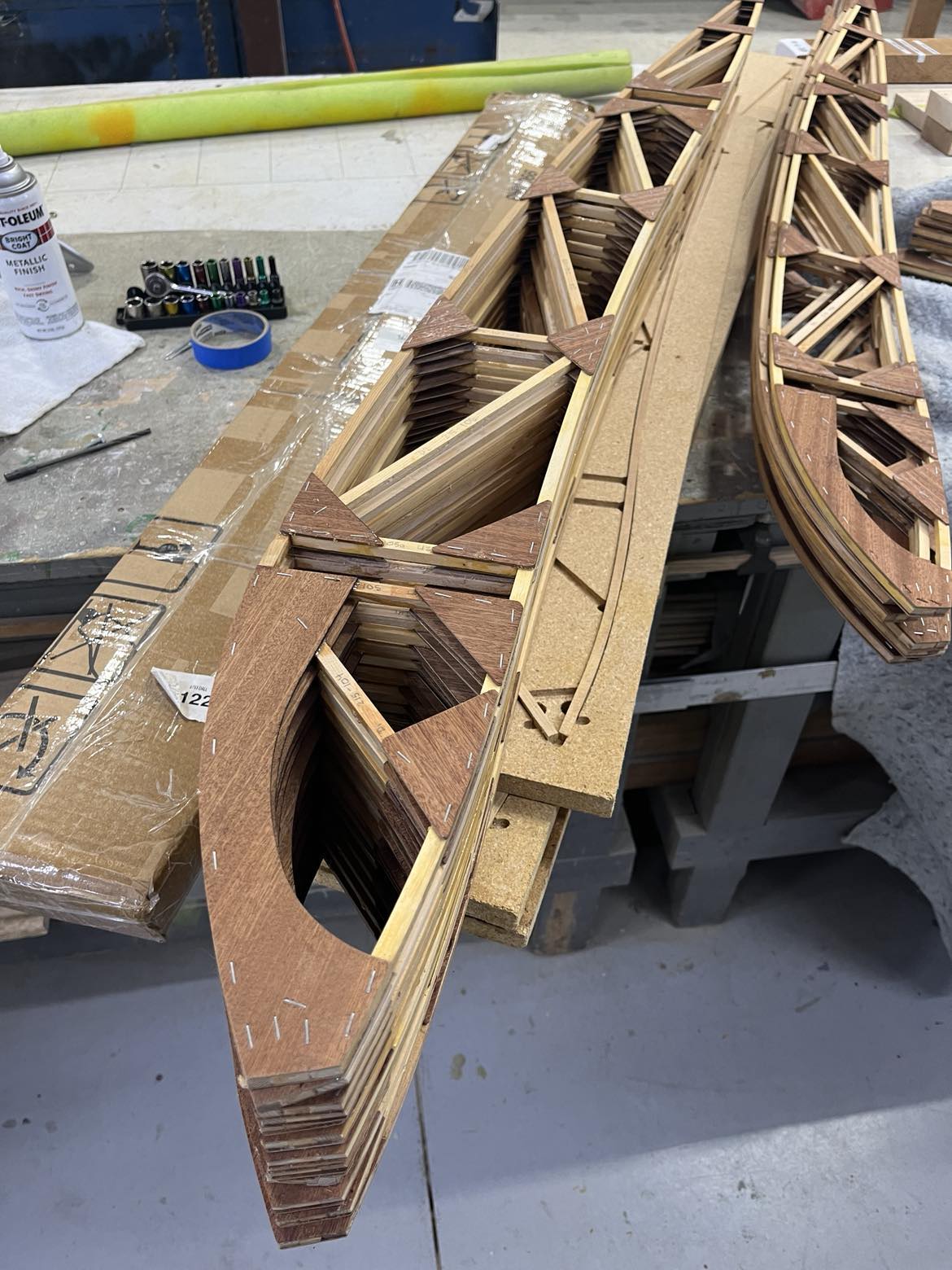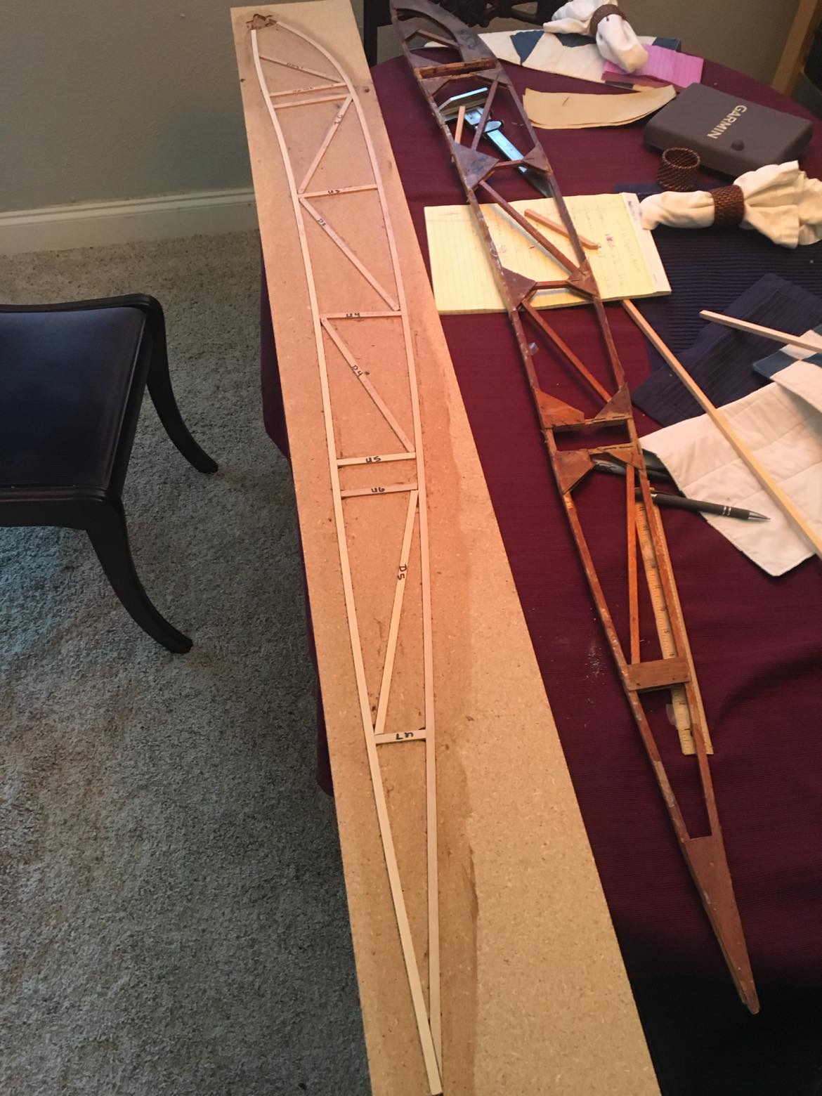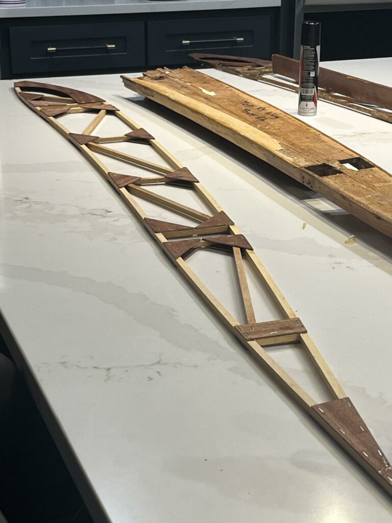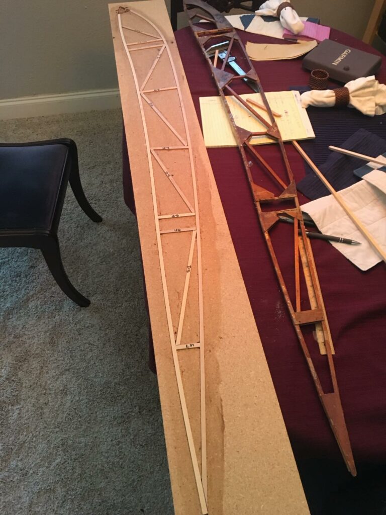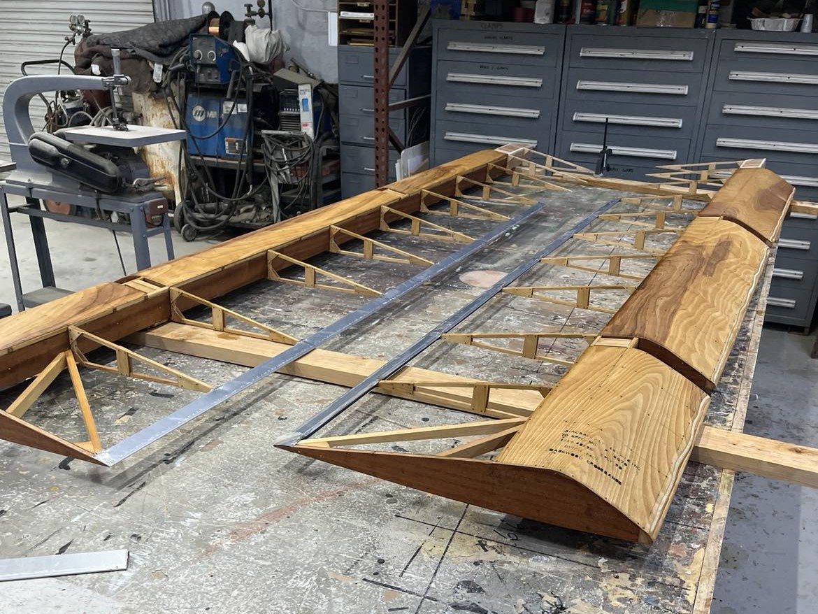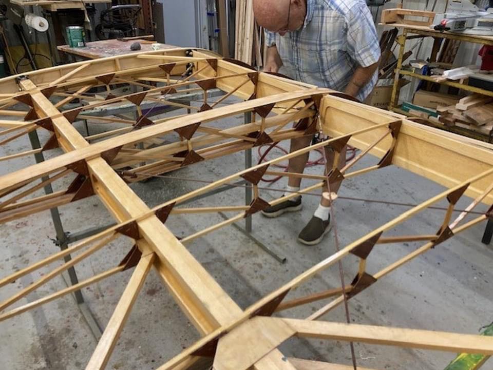 As of the time of writing the airplane has been completely disassembled and assessed for overall condition and viability, Donner said. “The steel fuselage frame, tail surfaces, and landing gear have been repaired as needed, media blasted, and primed. New wing struts have been fabricated. The wings and center section were evaluated and although they were in reasonably good condition, the glue joints and some old repairs were clearly showing their age, so I chose to replace all of the wood components in the airplane. I fabricated new ribs for the wings and center section and had all the internal parts inspected and fabricated replacements where warranted. I disassembled one top wing panel and one bottom wing panel so we could compare the existing ribs, spars, and other parts to the blueprints – other than the ailerons, they were found to be identical, so I had a full set of new spars constructed. The remaining two wing panels are still fully assembled and serve as a check and balance of ‘How does this all fit together in a completed component?’. As of today, the new center section is assembled and ready for varnish, new ailerons are complete through varnish and are ready for preparation for fabric, four new wing panels are ‘under construction’ and will be complete through varnish by the end of this summer.