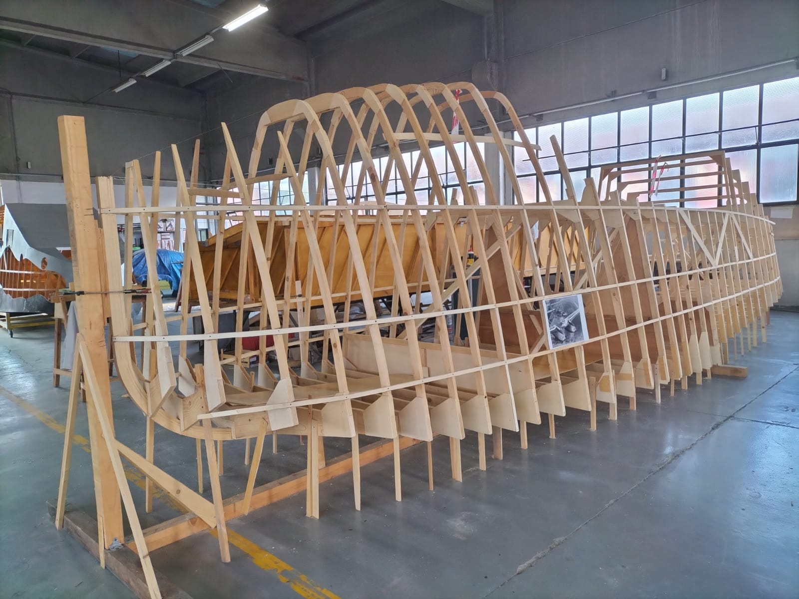 The two massive hulls, the twin booms, connecting tail plane, dummy engines with propeller and airscrews, and the central section are now complete. An original Garelli engine, driving the oil distribution, will be placed in between the two Isotta Fraschini main engines in the engine nacelle. One hull will be displayed with a partial covering, displaying the complex, all-wooden structure which would otherwise be hidden.