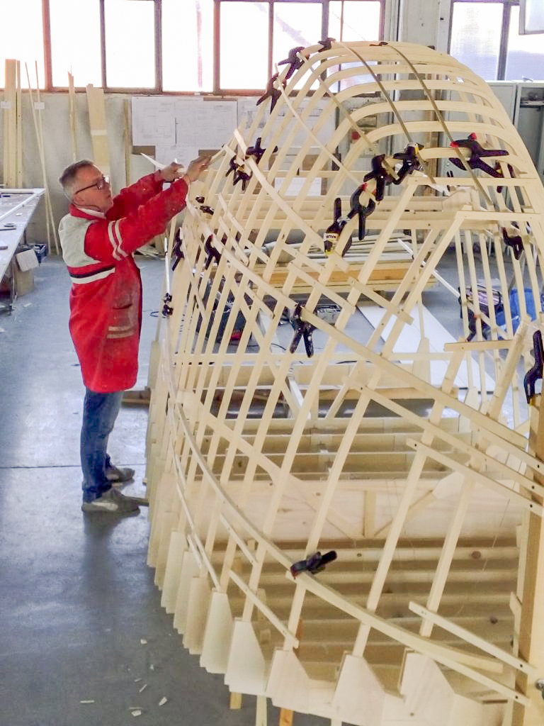 The hulls, currently under construction, are a significant manufacturing commitment, not so much for their structural complexity, but rather their significant size, being almost 10 meters (33′) long and more than two meters (6.5′) in width and height. They each weigh more than 700kg (1,570lbs). Perhaps the most exciting news at present is that the first wooden hull is approaching completion.