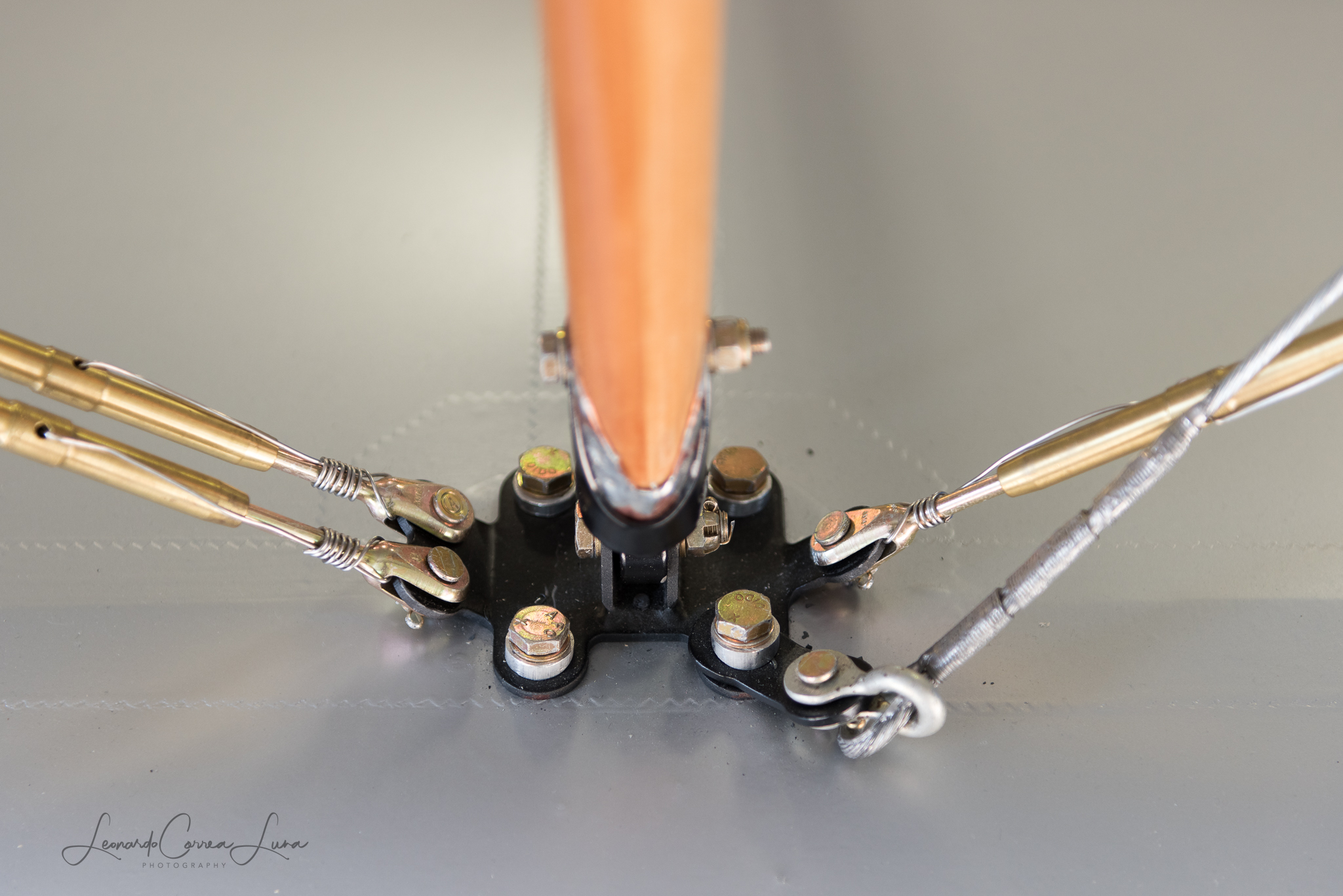 The build team were also able to modify modern, rectangular piano hinges for the cowlings, into the scalloped style which Curtiss originally employed. They also scratch-built a variety of control horns (integral hinge points) for the flying control surfaces, and when complete, surrounded them with a rhapsody of turnbuckles, cables, wires and swaged ends. The wire-spoked main wheels arrived as a gift. These units originated in Italy during the 1990s, part of a small production run for other Jenny restorations.