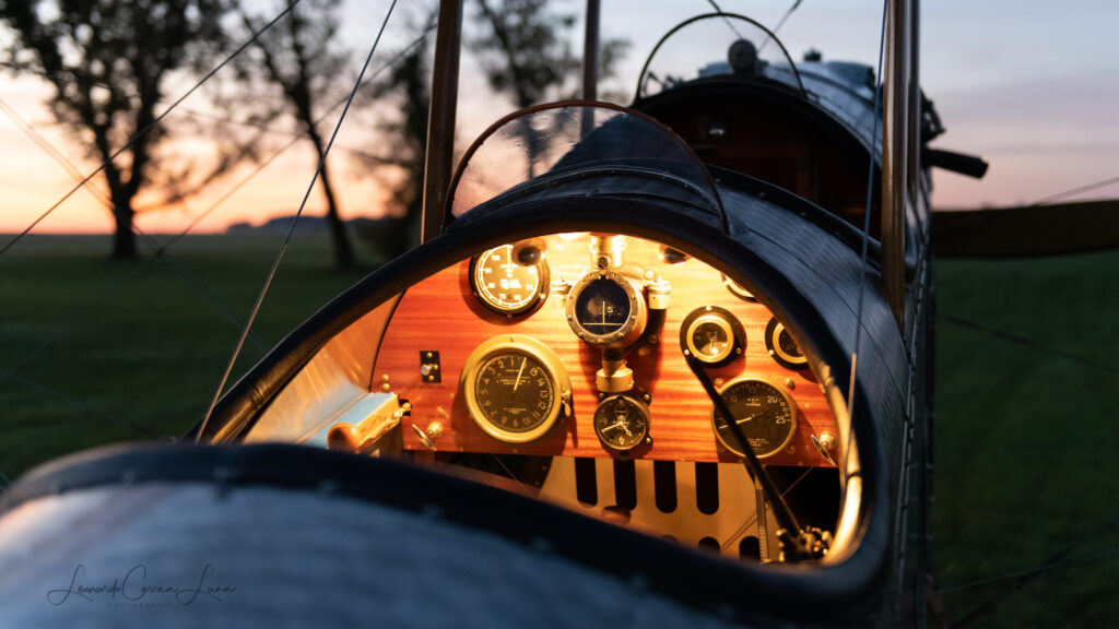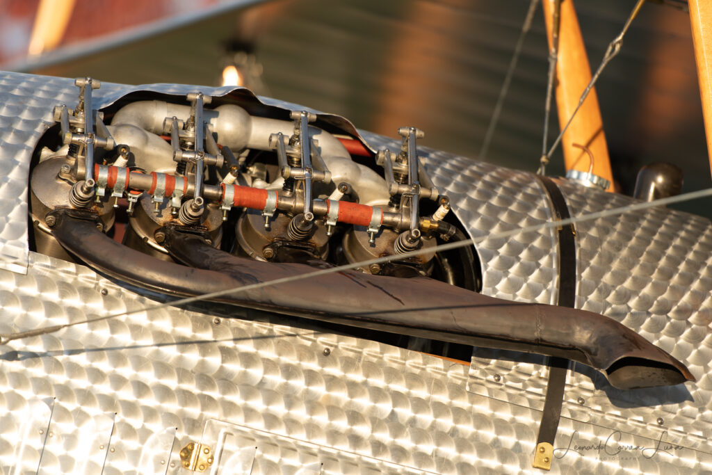 There is a lot of detail work in the aircraft. The metal engine cowlings have an eye-catching finish, recreating the original look with hundreds of carefully positioned swirls, known as ‘Jeweling’ or Engine Turning. Common to many aircraft types in the earlier Great War period, this kind of bare metal surface finish, while decorative, had a practical purpose as it helped disguise any marring which could occur during maintenance efforts. This was much appreciated by the hard-working barnstormers of the day, as the build team pointed out.