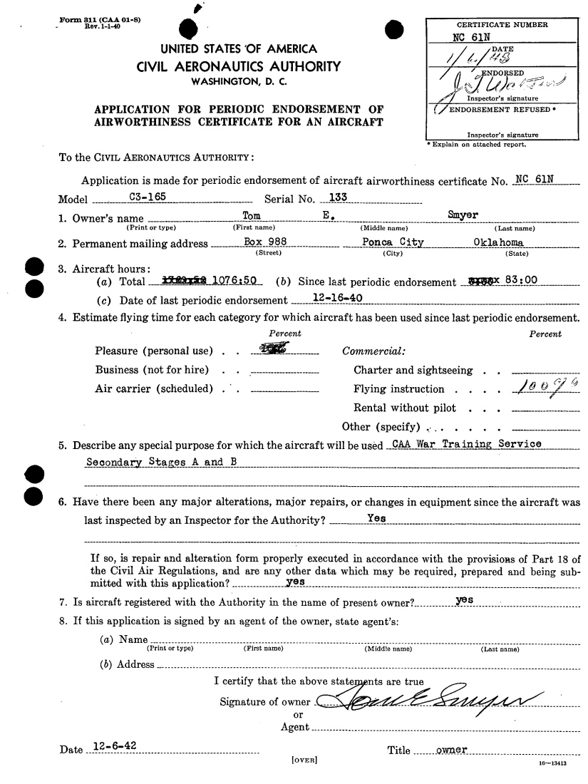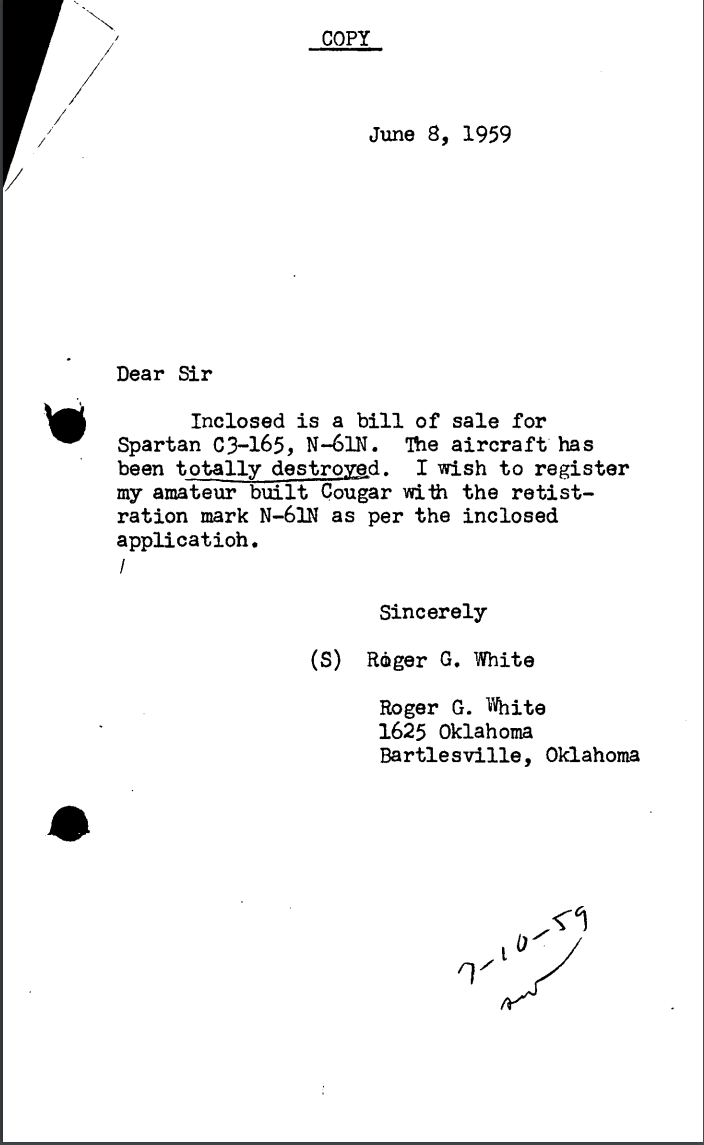 With Skelly coming on board, the name changed to Spartan Aircraft Company, with Willis Brown as president. Skelly Oil purchased aircraft #113, which painted it with a company livery and put nearly 600 hours on the airframe. From there, it was bought and sold several times, going to Ohio, Indiana, Texas, and then eventually back to Oklahoma in 1942. There, it was owned by flight instructor, Tom Smyer of Ponca City, who listed his address as “Airport.” He stated in the airworthiness application that the Spartan’s purpose would be for “CAA war training service secondary stages A and B”. Perhaps this airplane was used to train some of America’s WWII pilots but unfortunately, no other history is available at this time. In 1945, it was sold and extensively modified to become an agricultural sprayer, which is a very hard life for a wood and fabric aircraft. Francis Rourke operated Southwest Agricultural Flying Enterprises. There is even a handwritten letter to the CAA, requesting a replacement registration, as the original “was blown out of the ship”. It was last registered as airworthy in 1948, with the CAA making an inquiry into its status in 1955. At that time Rourke stated that Southwest still owned the airplane “and is in the process of rebuilding”. By 1958 it was sold to Roger White who wrote to the CAA that same year, declaring the aircraft was destroyed and requesting to use 61N for his homebuilt Cougar aircraft. He held onto the remnants of the Spartan until Bruce took possession of it in the early ’70s, eventually getting his hands on the drawings from the gentleman who rescued them.