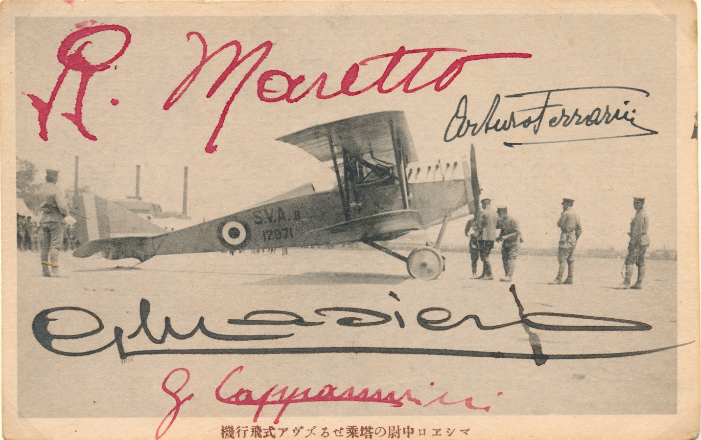After Rangoon came Bangkok, Hanoi, Canton, Foochow, and Shanghai, where Ferrarin stopped over for seven days. The successive leg to Tsing-Taowas was very difficult due to the arrival of a typhoon; this created many problems during the flight. The flight to Peking (Beijing), however, represented an enormous success, and here the men arrived to a triumphal reception. The final phase of the mission was now approaching. The following legs quickly brought the Italian crews to Kowangtze, Shingishu and Seoul in Korea. Despite technical problems and adverse weather, with ability, audacity and not a little good fortune (Masiero among other events crashed his second SVA while taking off from Canton, miraculously emerging unhurt from the wreckage along with his engineer Maretto), Ferrarin and Cappannini, flying in SVA no. 13148, managed to set their wheels down on Japanese territory near Osaka on May 30th. They were greeted by an immense crowd and local dignitaries.