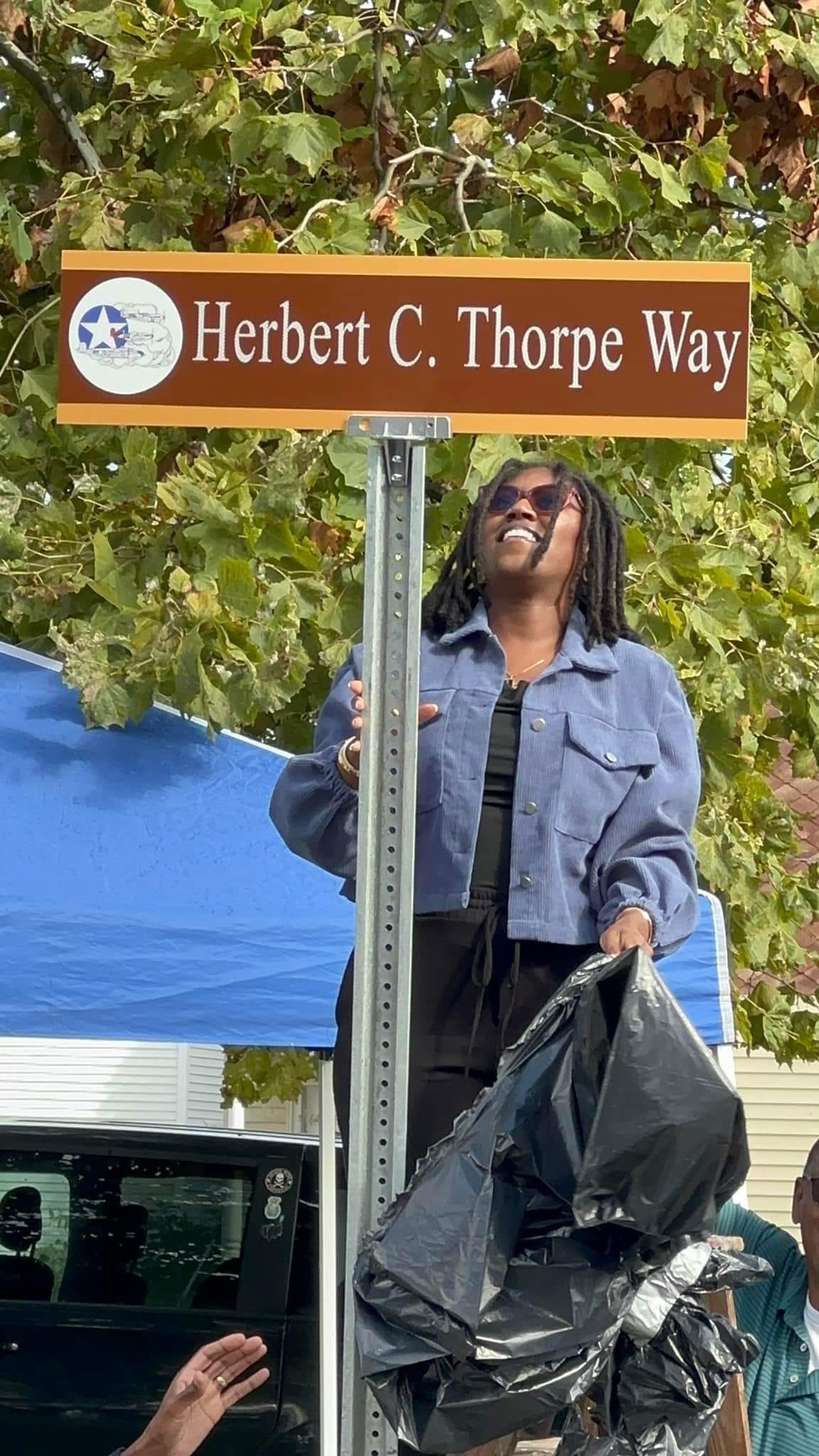 Herbert Thorpe would continue to work at Griffiss until 1983, when he partially retired. He continued to work part-time as a counselor for the nearby Mohawk Valley Community College. In 2016, he attended a ceremony at the National Warplane Museum, in Geneseo, New York to receive the Congressional Gold Medal (along with five other Airmen and their families.) In 2023, Herbert was invited back to the USAF Labs for a ceremony to name one of the development buildings in his honor. He became a member of countless community and African American organizations, doing good for the people around him. Mr. Thorpe passed away in January 2024, at the age of 101. He was a trailblazer, a true representative of the Redtails’ credo of never giving up, and always helping those around you. On September 7th, 2024 the Rome, NY Chapter of the NAACP, along with the City of Rome and Rome Historical Society, dedicated a street “Herbert C. Thorpe Way.” An eternal tribute in the community that Mr. Thorpe served in and loved so much. His name forever stands as a pillar of service, courage, ingenuity, and friendliness. His legacy, just as that of his fellow Tuskegee Airmen, will fly forever.