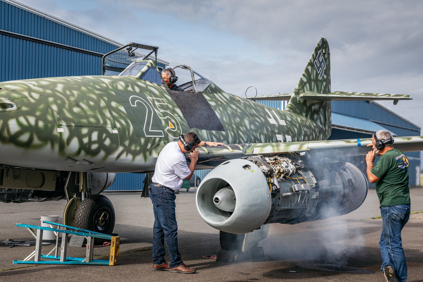 One of the biggest challenges in the restoration of the aircraft was in restoring the engines to be operational but yet safer than those built during the war. The original Junkers Jumo 004s were built in desperate conditions with fragmented supply chains producing often sub-standard materials. As a result, German WWII jet engines had an exceedingly low life expectancy, with some engines only being able to run for just 10 hours before requiring a complete overhaul. Many warbird enthusiasts doubted that the original engines could be restored to working order, but Paul Allen persisted. He hired Aero Turbine Inc. of Stockton, California, to overhaul the two Jumo 004B turbojet engines, and by 2015, the first test runs of the engines proved successful, marking the first time that any version of the Junkers Jumo 004 had run since 1951, when the Czechoslovakian Air Force retired the last of their locally-built Me 262s, the Avia S-92s, which were powered locally-built 004s designated as the Avia M-04.
