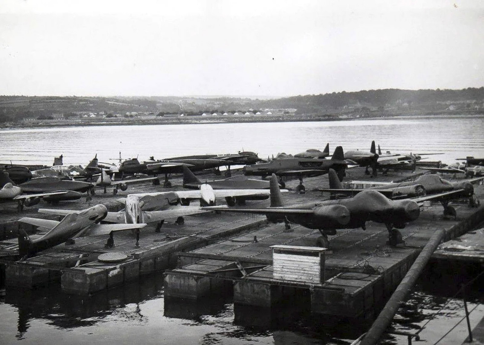 Ground personnel were tasked with shrink-wrapping the airplanes to protect them from the sea spray, for the ship’s hangar deck was filled with her full complement of combat aircraft, and many of the larger aircraft could not be stored below the flight deck either. After being loaded on barges at Querqueville and towed to the port, the German aircraft were hoisted aboard HMS Reaper by crane, and the ship left port on July 19, 1945. On July 31, the Reaper arrived in New York Harbor, and the German aircraft were barged to Newark Airport, which was still under the control of the U.S. Army Air Force after being requisitioned from the civilian authorities. Meanwhile, HMS Reaper began its next journey for the Panama Canal to join the British Pacific Fleet in the ongoing fight against Japan, but before the carrier transited the locks, it received news of the Japanese surrender and the end of WWII.