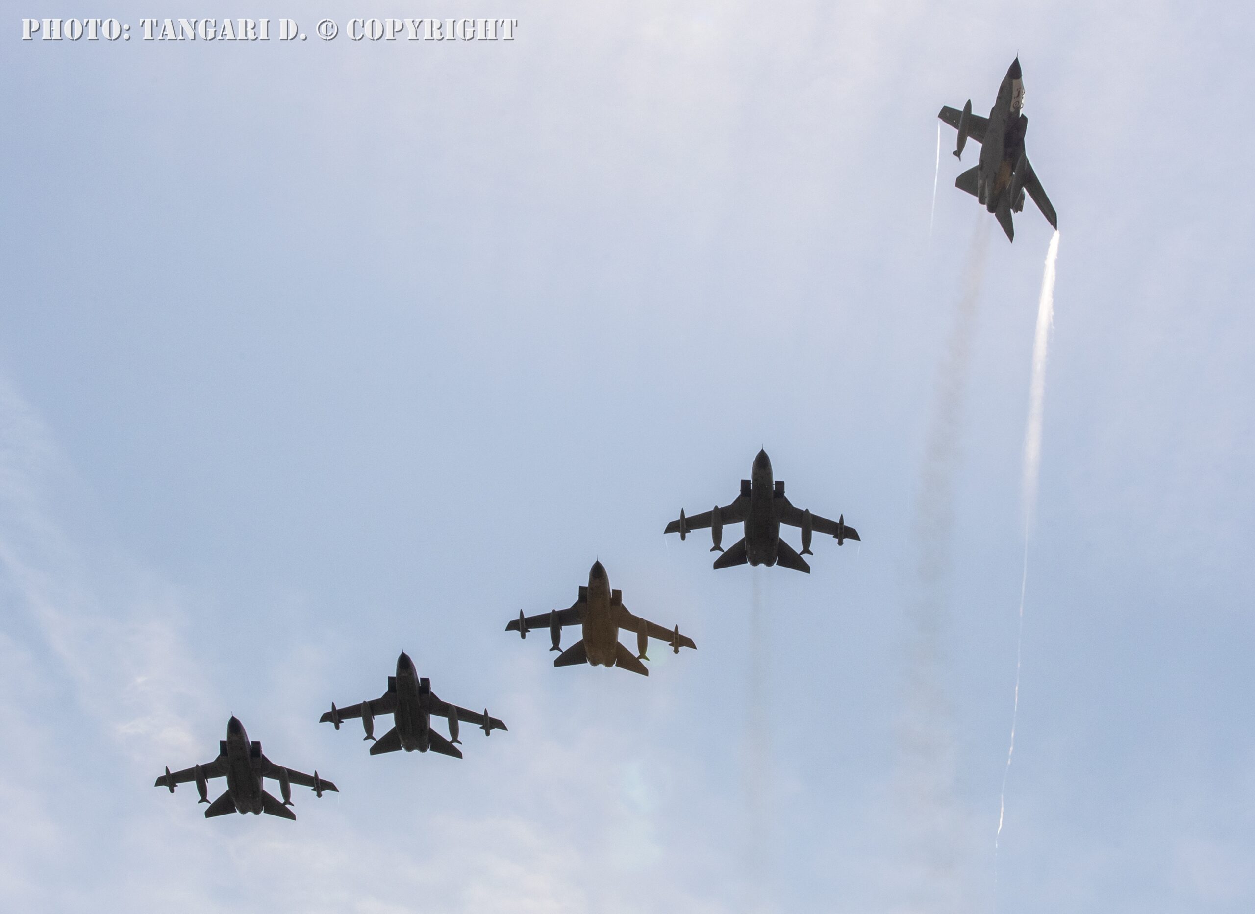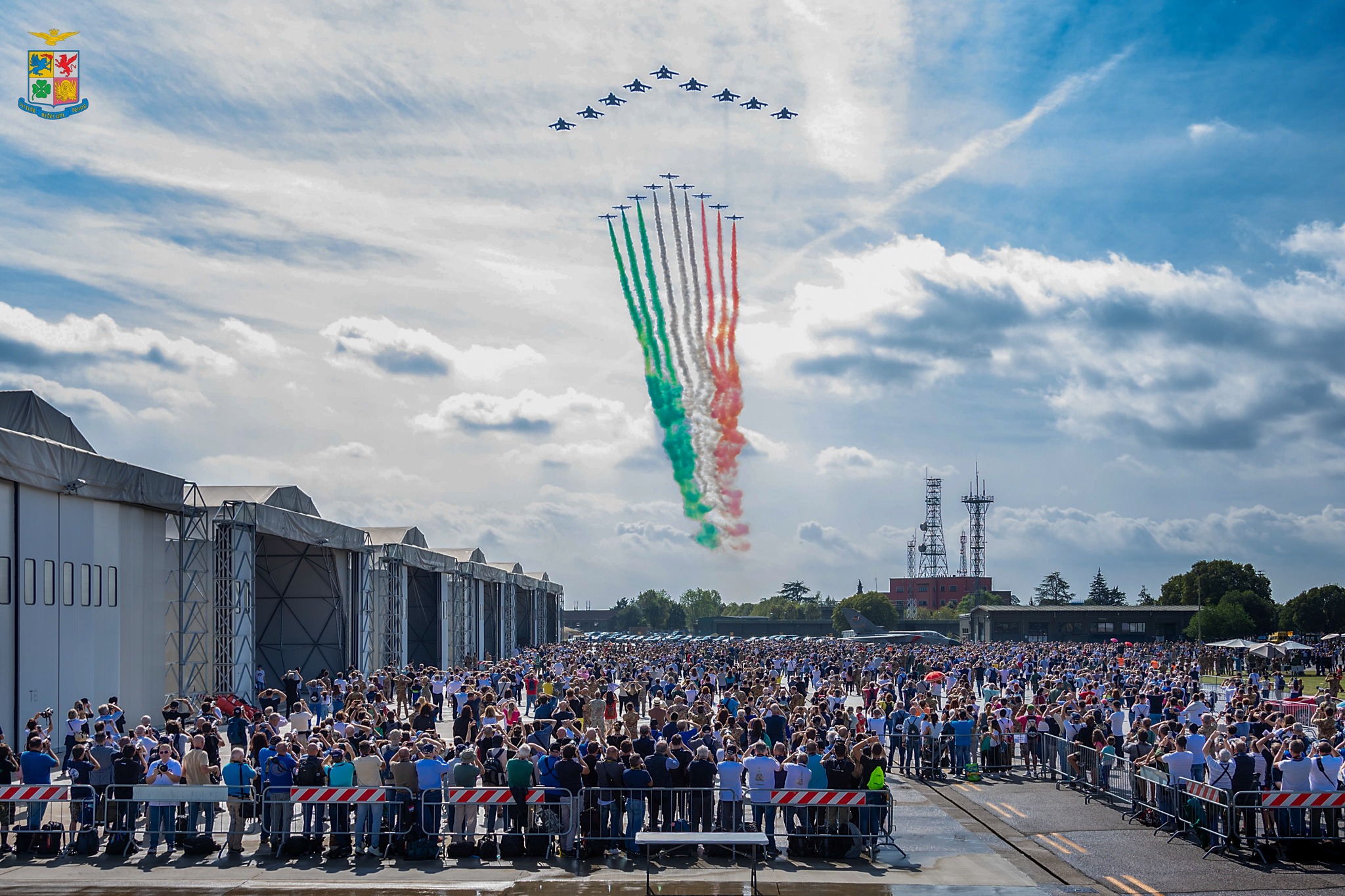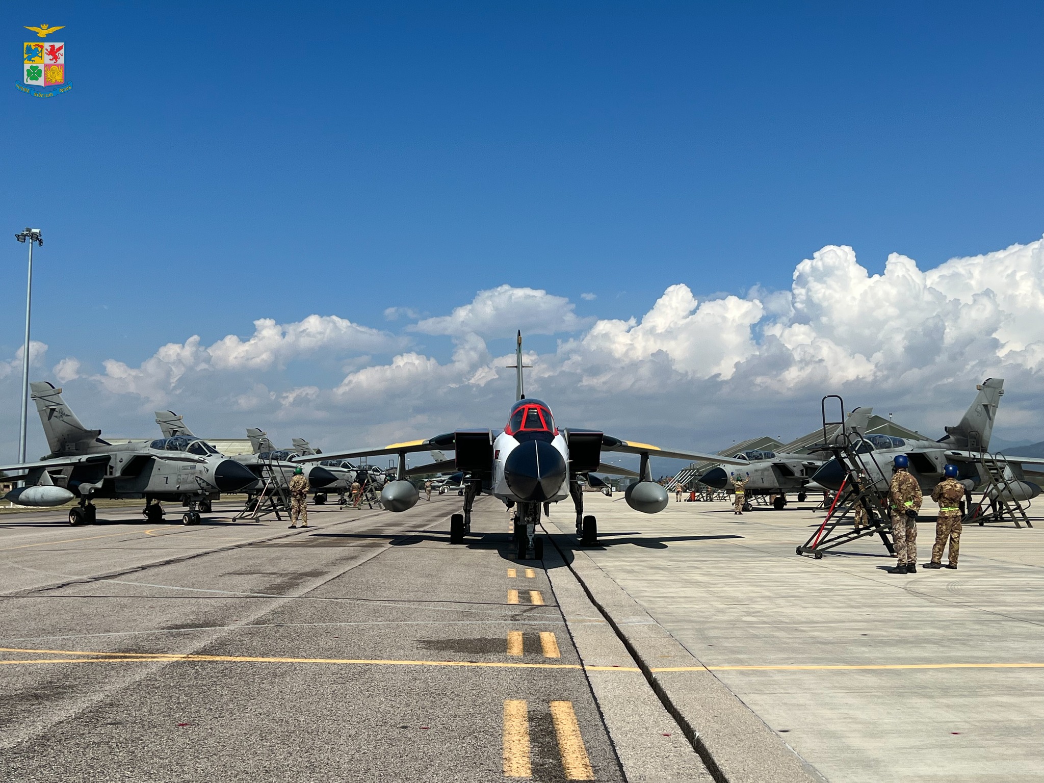 When the Frecce Tricolori completed their performance and came in to land, the Tornados reappeared with an initial rhombus formation and, subsequently, a double wedge alternating with various low passes from a solo Tornado. The Tornados then pealed off to land, with the solemn conclusion to the event seeing all ten Tornados parked on the square in front of the crowd and media immortalizing a day which will echo in aviation history.