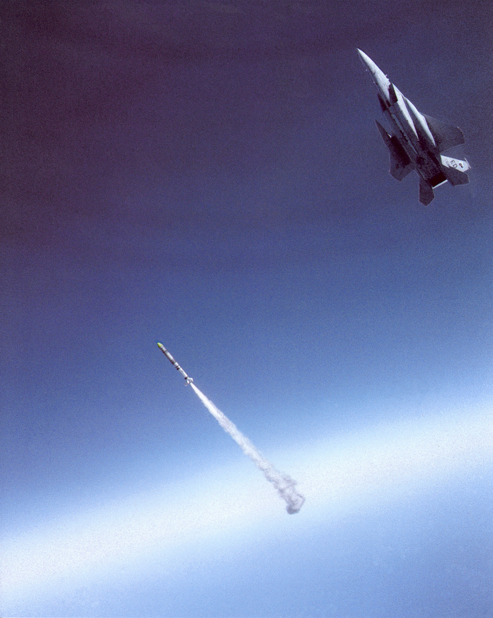 Maj. Wilbert “Doug” Pearson successfully launched an anti-satellite, or ASAT, missile from a highly modified F-15A Sept. 13, 1985 over Edwards Air Force Base, Calif. He scored a direct hit on a satellite orbiting 340 miles . (USAF photo)