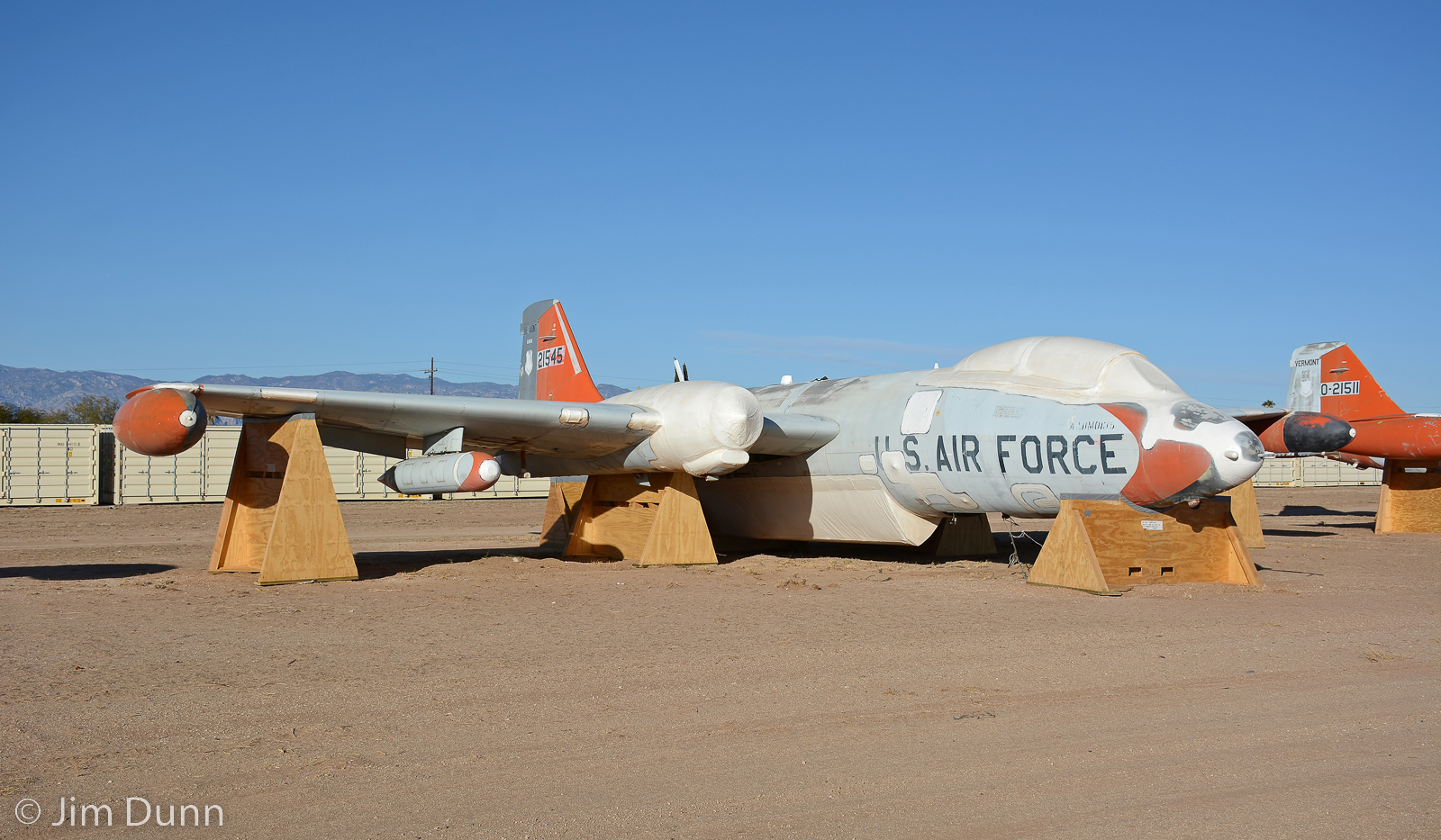 While assigned to the 405th TFW at Clark AB, Philippines, commanded by then Col. Chuck Yeager, Martin B-57B 52-1545 was based with the 8th Bomb Squadron flying combat missions from Da Nang AB and Tan Son Nhut AB, in South Vietnam. In 1968, it was sent to the Military Aircraft Storage and Disposition Center (MASDC) at Davis-Monthan AFB before being converted to an EB-57B and assigned to the 134th Defense Systems Evaluation Squadron with the Vermont ANG. She returned to MASDC for retirement on December 2, 1981. (photo by Jim Dunn)