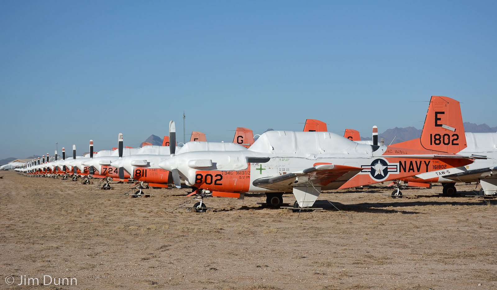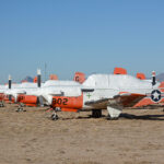 In a previous era, the Beech T-34C Turbo Mentor would be viewed as a very desirable entry level warbird, and judging by the prices commanded by the few in the civilian market the taxpayer would be seeing a nice return on their investment. Those days however are long past and this group with T-34C 161802/802, from TAW-5 at NAS Whiting Field, Florida, at the head of this lineup will bring only a small return on the dollar when they go to the scrapper after the final few T-34Cs still in service are retired. (photo by Jim Dunn)