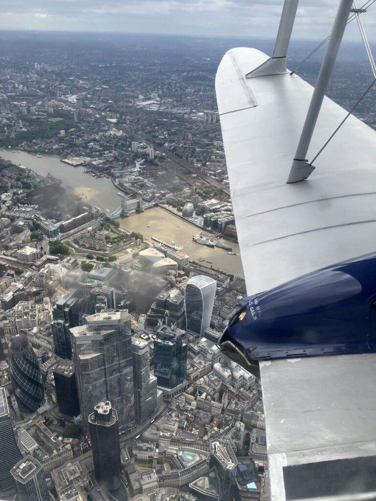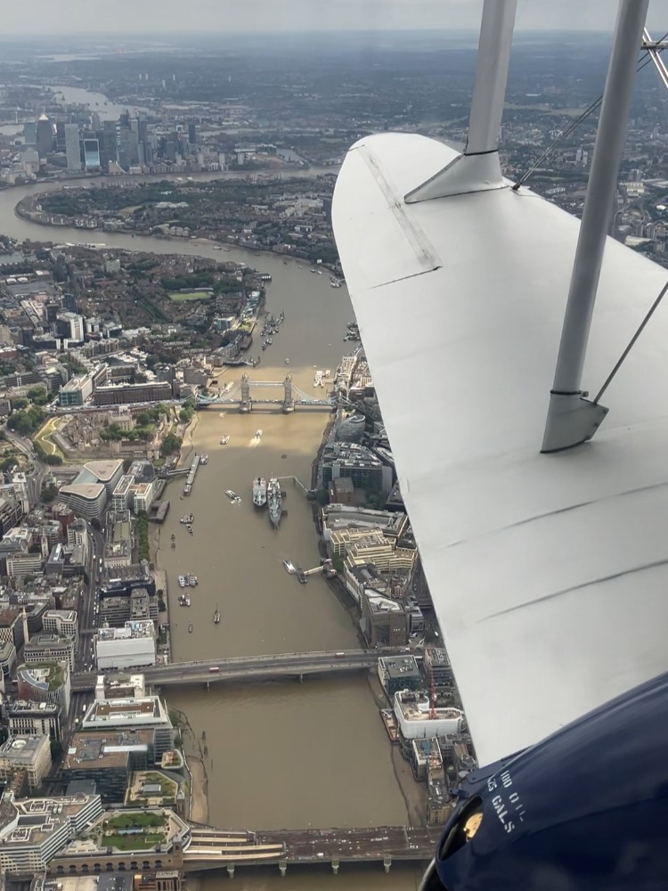 It is an extraordinary sensation to bank gracefully in a vintage aircraft over the capital. The curve of the Thames passed below, along with landmarks such as the Houses of Parliament, Buckingham Palace, Tower Bridge and Battersea Power Station (another Art Deco icon built between 1929-1941). At 1,016 feet high the modern Shard building seemed to reach up at us as we passed well above.
