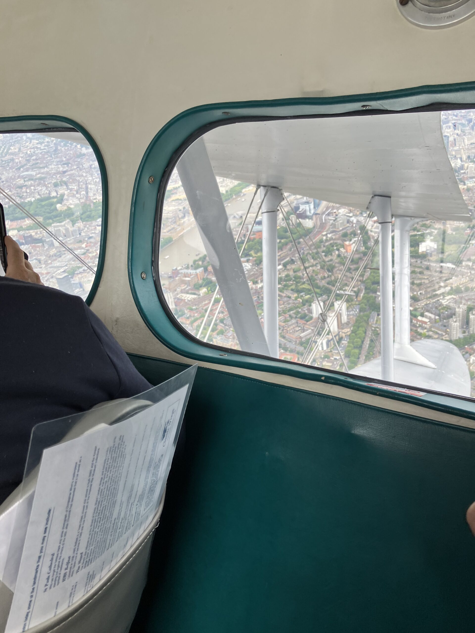 Heading south from Duxford, we reached an altitude of around 1,500 feet under the cloud base, with an airspeed of around 100 mph. Light aircraft passed us, going the other way. The cabin was enclosed but an opening in the pilot’s cockpit let airflow gently circulate. The view from my window — of the airliner’s silver wing struts and bracing wires — soon began to feel natural. A sense of the past was powerful. The twin piston engines purposefully resonated. There was little turbulence on the hour-long trip, although the wind periodically gusted and the Rapide gently bucked. The verdant countryside inexorably gave way to congested London.