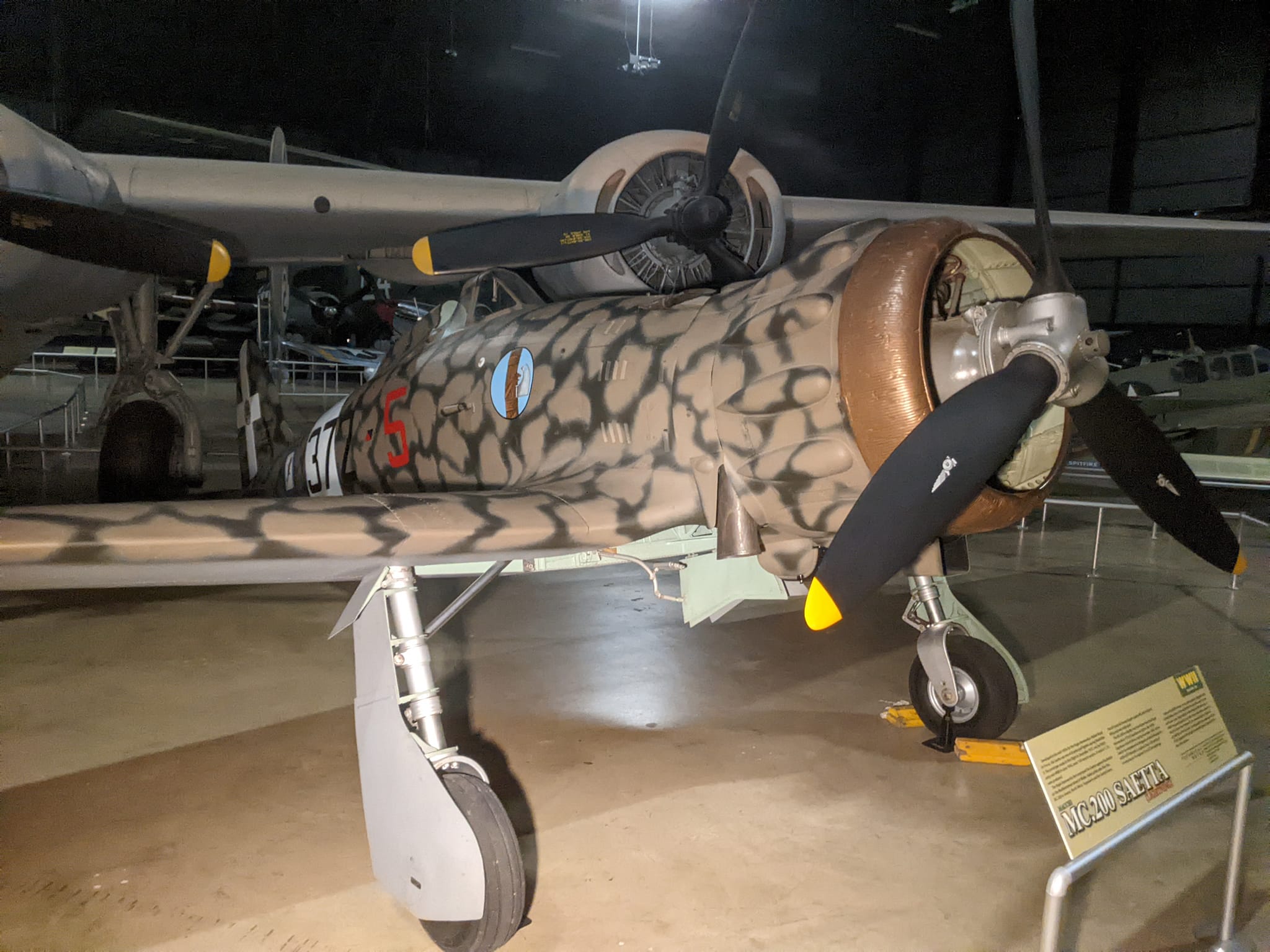 With MM.8146 being restored, it was decided that it would return to the United States, this time to enter the collection of the National Museum of the United States Air Force at Wright-Patterson Air Force Base in Dayton, Ohio. While the museum already had several German and Japanese aircraft of WWII displayed inside its WWII gallery, the Macchi C.200 Saetta filled a gap in the NMUSAF’s collection by adding an Italian WWII aircraft. The Saetta, however, was not the first historic Italian aircraft in the museum’s collection, for in 1987, the NMUSAF had acquired a Caproni Ca.36 WWI bomber from the Museo Aeronautica Caproni di Taliedo for its Early Years Gallery to commemorate the American aircrews that flew similar aircraft alongside Italian airmen on the Italian Front. Today, the Macchi C.200 Saetta 372-5 can still be found in the museum’s World War II Gallery, sitting beside the museum’s Consolidated B-24D Liberator 42-72843 “Strawberry Bitch”, which flew 56 combat missions flying out of North Africa and Italy to attack targets in Italy, the Balkans, and Austria while serving with the 512th Bomb Squadron of the 376th Bomb Group in the Mediterranean Theater of Operations.